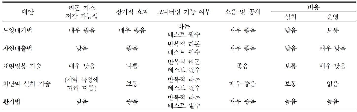같은 기준들을 토대로 다양한 라돈가스 처리 기술들이 존재하며 각 기술의 효과와 평가는 표 4에 정리되어 있다.