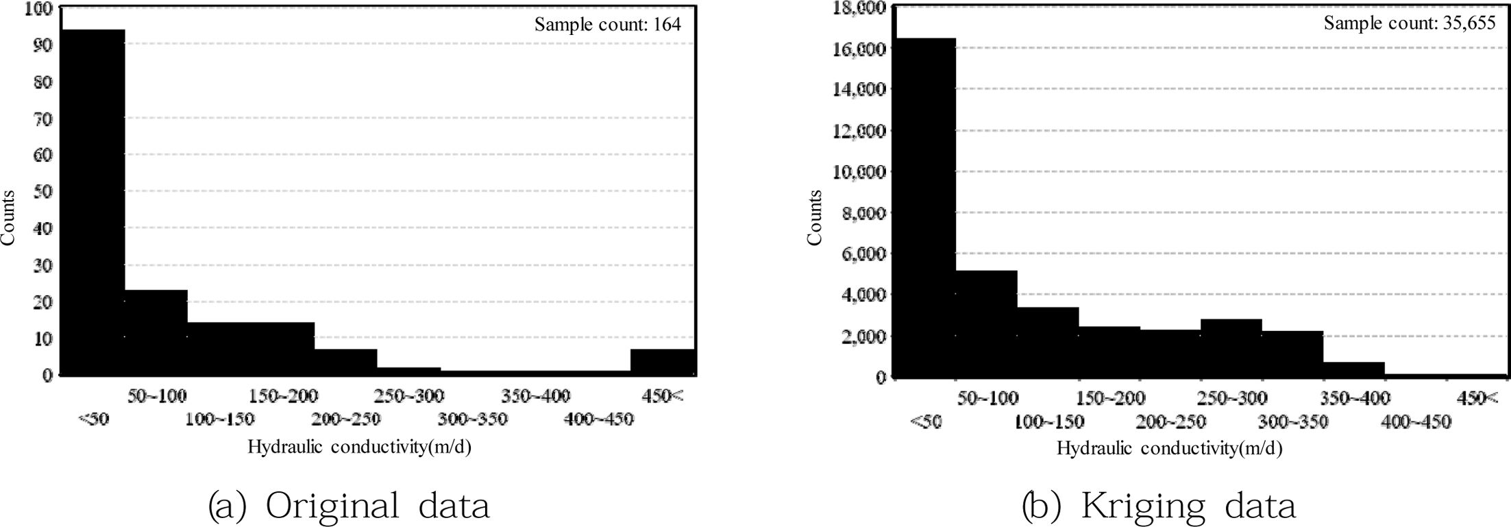 분포는 방사형 집수정을 기준으로 북쪽과 남서쪽이 북서쪽과 동쪽보다 높은 특성을 보인다. 수리전도도의 원자료 및 크리깅에 의하여 생성된 자료의 히스토그램이