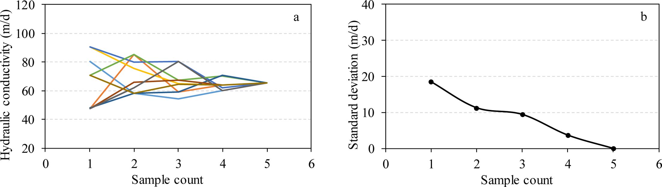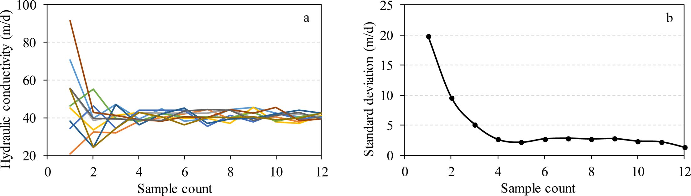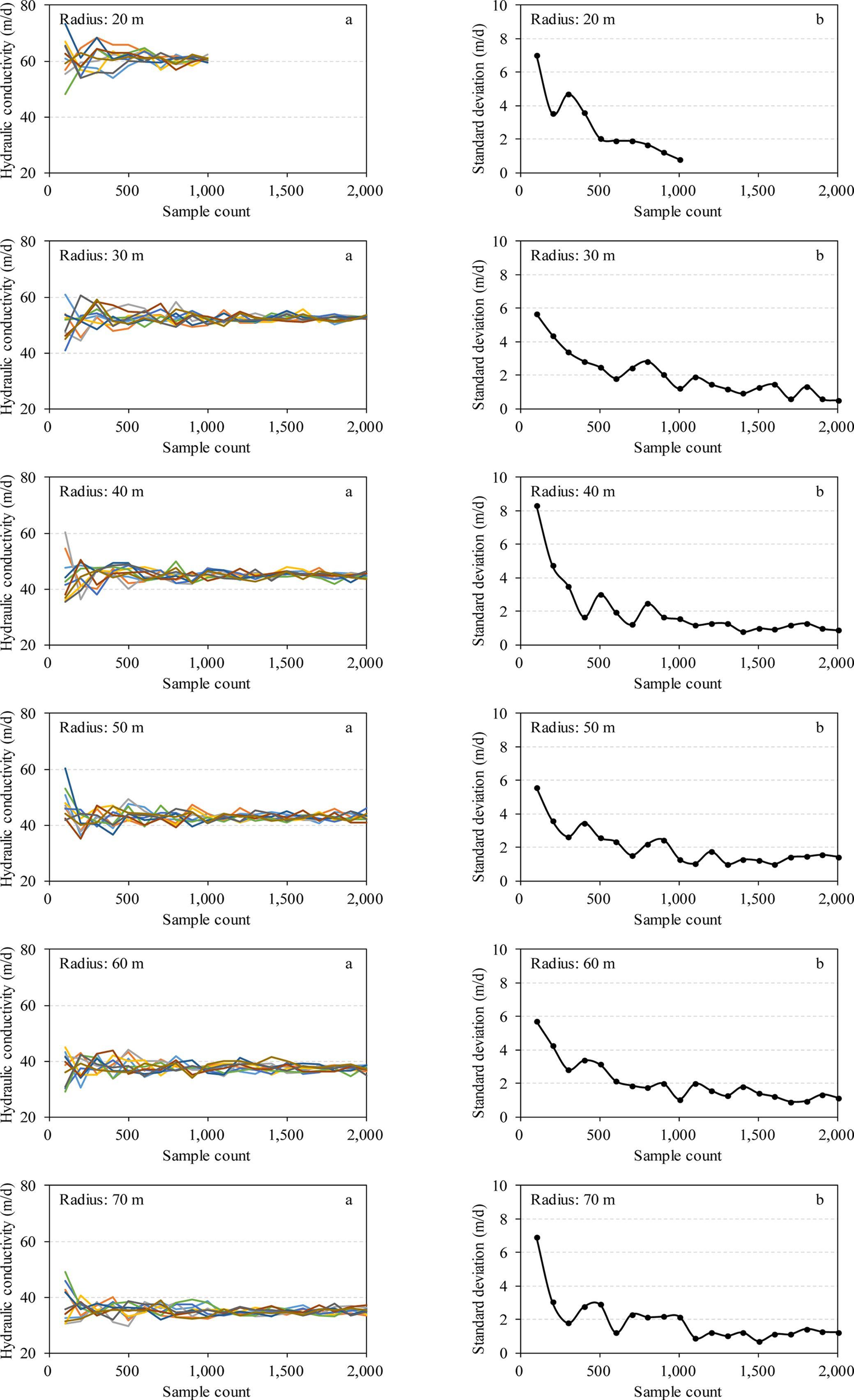 각 분석영역에 대하여 표본의 수에 따른 평균 수리전도도를 도시하였다(Fig. 4a). 반경 20 m 및 30 m 분석 영역의 경우는 평균