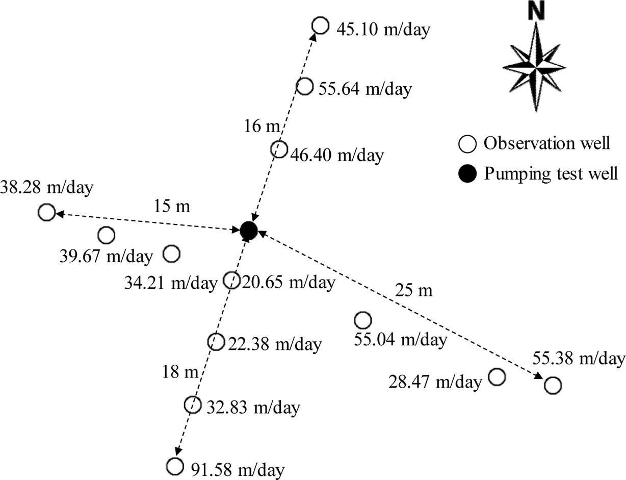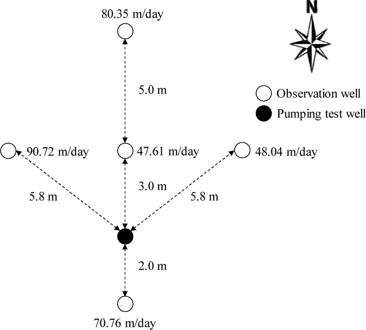갖는 정확한 수리전도도를 추출하기 위해서는 1) 1개 양수정과 4개의 관측정으로 구성된 1 세트의 실험 체계가 기본적으로 요구되며, 대안으로서