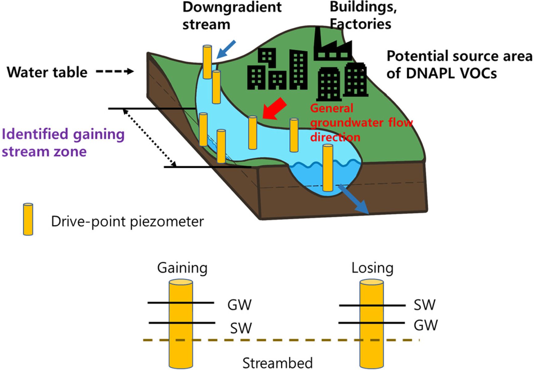 Fig. 7 Example of investigative strategy for groundwater – surface water interface. Gaining and losing stream assessment can help determine whether groundwater discharges to stream and delineate length of gaining area in stream. GW= groundwater, SW= surface water [Figure redrawn from the original in US EPA (2018)]. |