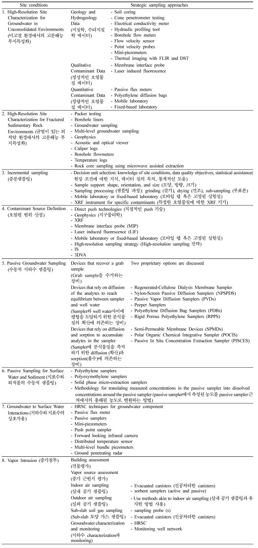 동일하게 적용되는 샘플링 기법이 아닌 현장 각각의 조건에 따라 다른 최적의 샘플링 기법을 적용해야 한다. 특히 충적층 등에 존재하는 지하수와 균열