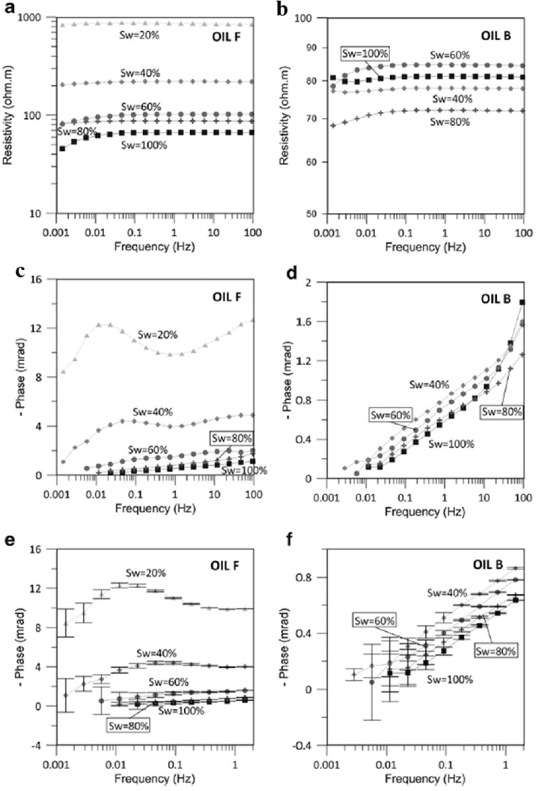 Fig. 4 SIP laboratory measurements for non-degraded (oil F) and degraded oils (oil B) including resistivities (a and b) and phases (c, d, e and f) value based on several frequencies, respectively (Blondel et al., 2014); Note (e) and (f) are phases at frequencies lower than 1 Hz. |