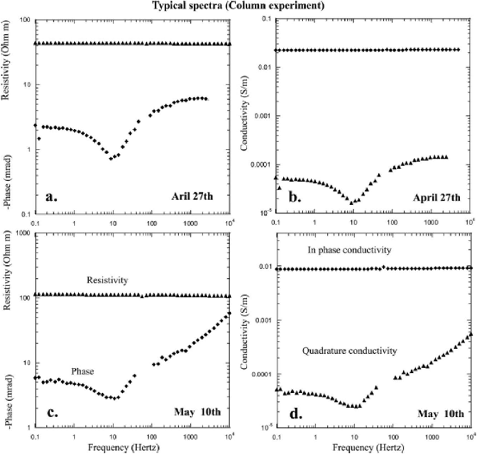 Fig. 5 Result of resistivity and phase (a, c) and conductivity (b, d) of the contaminated water from a reservoir at Oak Ridge, Tennesse, US. Results of (a) and (b) are from April 27th, while (c) and (d) are from May 10th of 20 (Revil et al., 2013). |