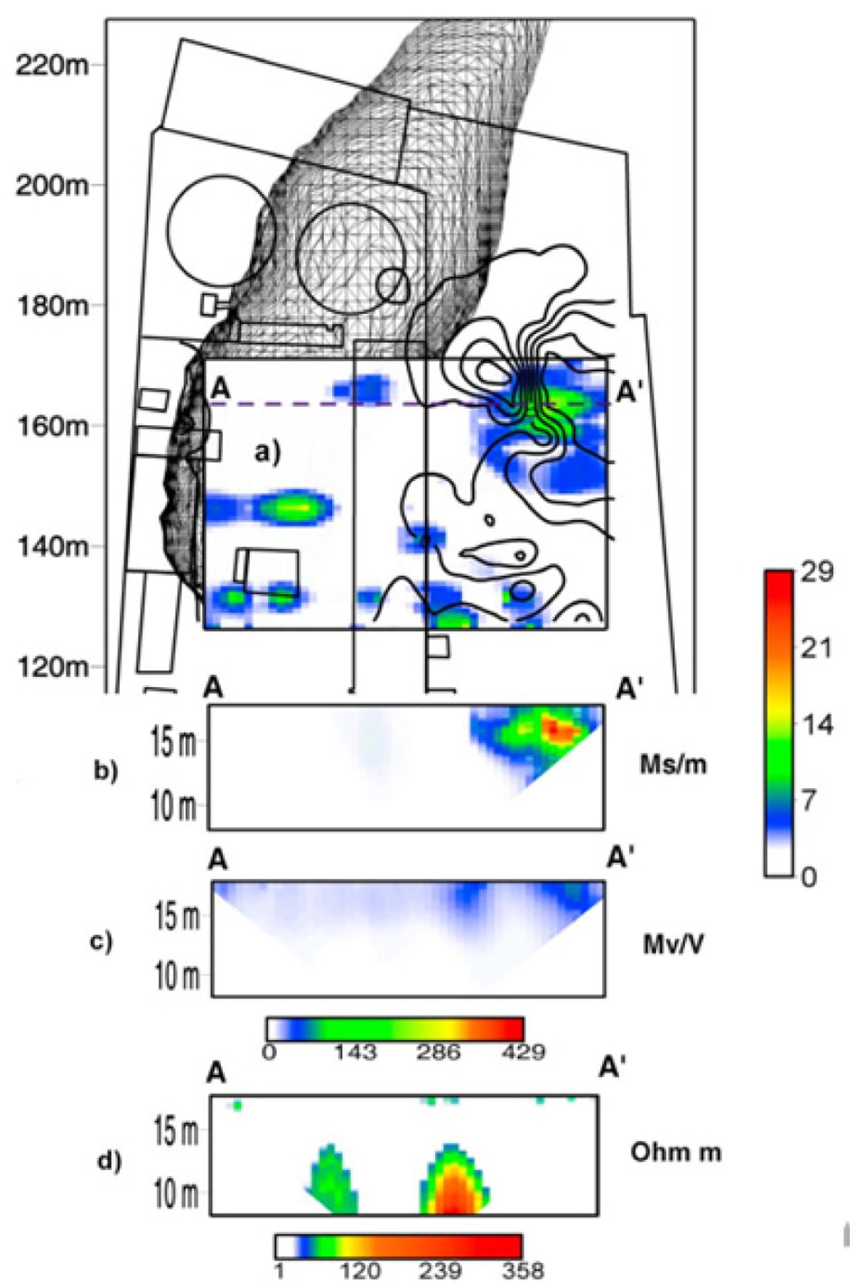 Fig. 6 Inversion results of DC-IP data along line A‐A′ to detect NAPL leakage from the gas plant at Portadown, Northern Ireland (Doherty et al., 2010); (a) Map view of chargeability normalized by resistivity, while (b) normalized chargeability, (c) chargeability, and (d) resistivity are the section view of A-A′. Black mesh is a modeled contaminant plume. |