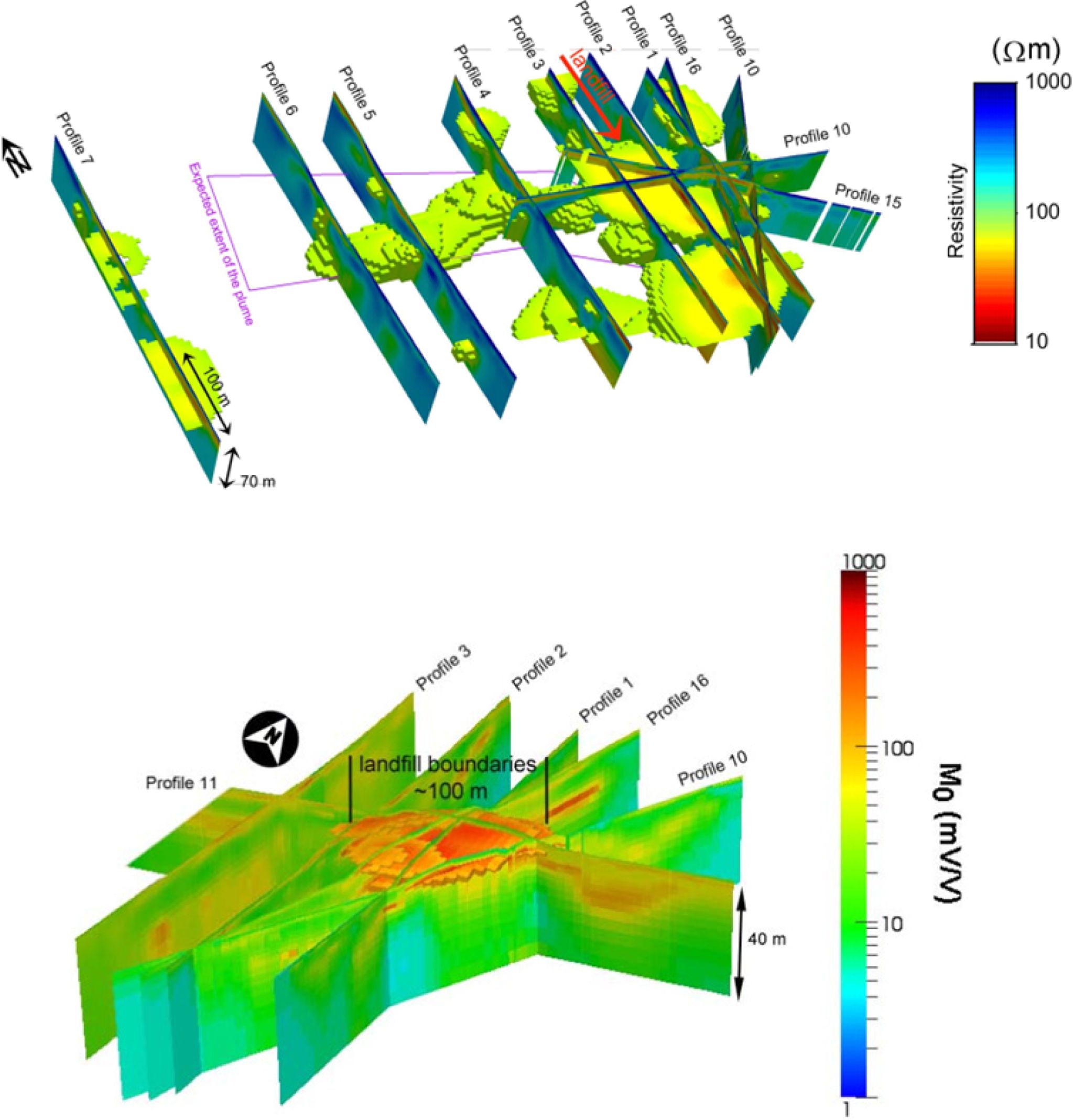 Fig. 7 3D resistivity and chargeability plots for Hørløkke landfill. The iso-volume model is expressed with resistivity lower than 100ohmm and chargeability (M0) above 100 mV/V. The anticipated extent of the plume is drawn in purple (Gazoty et al., 2012). |