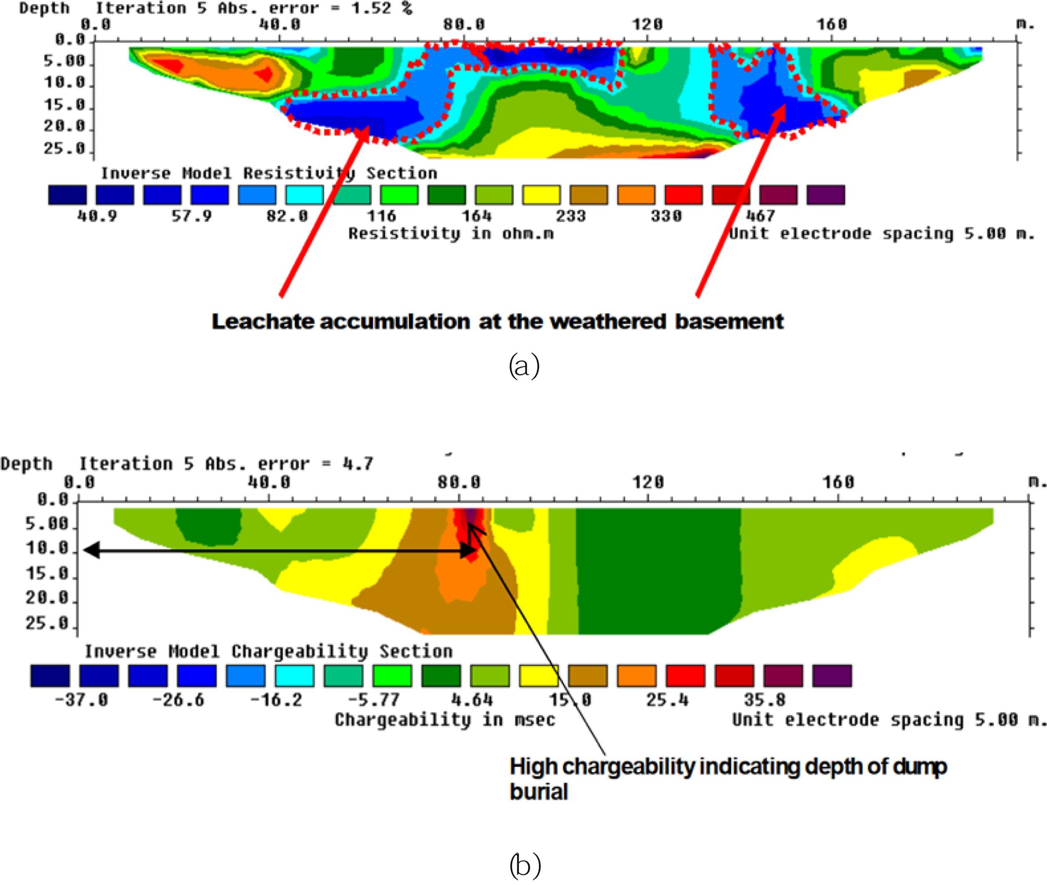 Fig. 8 Recovered models of (a) resistivity and (b) chargeability, respectively for a landfill in Kaduna, Nigiria (Jegede et al., 2012). |