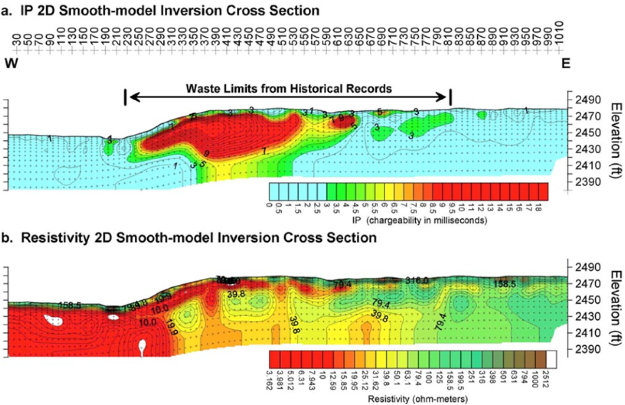 Fig. 9 Survey results for Line A at the Tumamoc Landfill. Vertical exaggeration of both plots is 1 to 1.5 and the unit of distance is in feet. (a) IP results with 1 millisecond contour interval, and (b) Resistivity results with logarithmic contour interval (Carlson et al., 2015). |