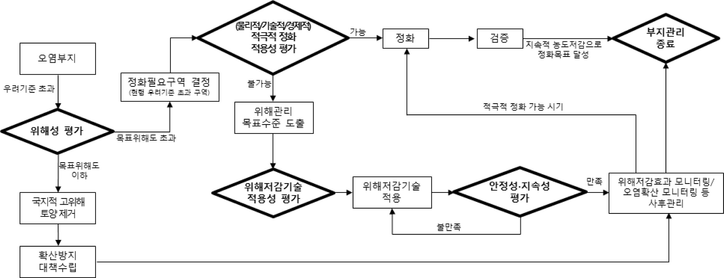 및 적극적인 정화를 기본틀로 하고, 해당 부지의 위해성평가 결과, 오염특성 등을 반영하여 부지특이적인 위해저감기술의 적용 및 사후 모니터링과 궁극적인