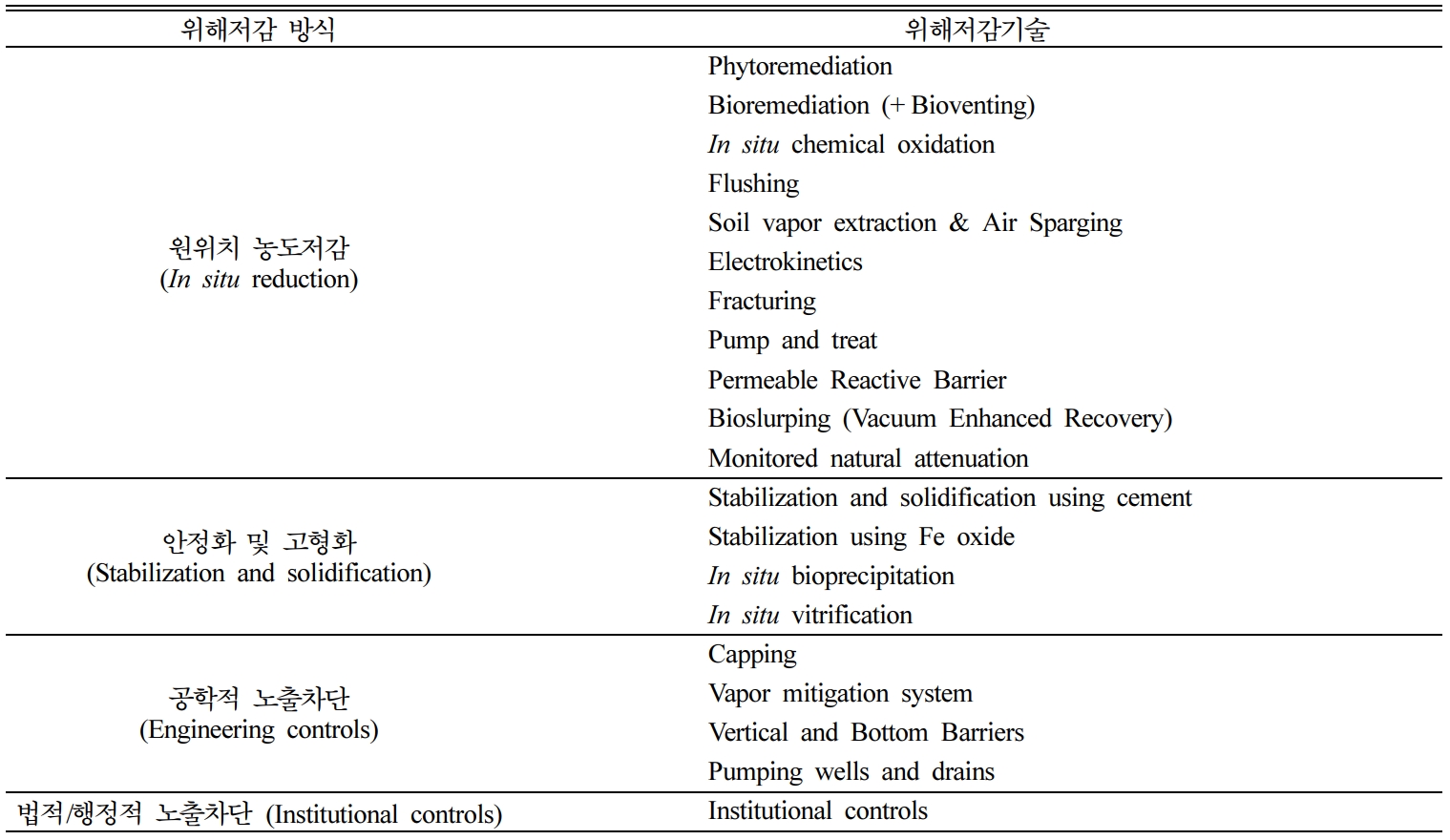 중요하다. 하지만 단기간에 농도 저감이 가능한 기술만을 정화기술로 활용해오던 우리나라에서는 위해저감기술이라는 개념 자체와 활용할 수 있는 기술의