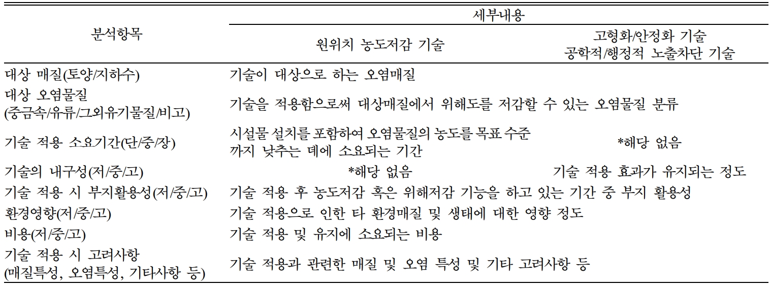 Table 2의 분석항목은 우선 위해저감기술의 활용성 측면에서 기술이 대상으로 하는 매질과 대상 오염물질로 구성된다. 오염부지 위해성평가에서
