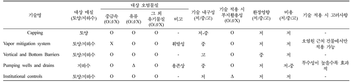 것 외에도, 휘발성 물질 및 용존상 물질에만 적용 가능한 기술에 대해서는 이를 비고란에 표시하였다. 위해성평가에서 오염물질의 휘발성의 여부는 유효한
