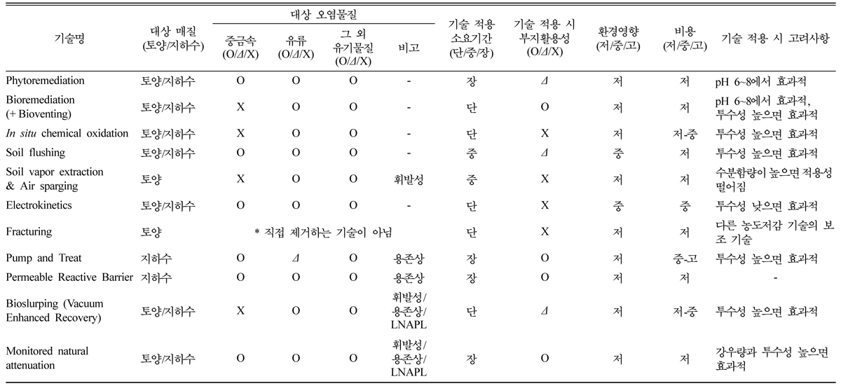 원위치 농도저감기술(Table 3)은 시간은 보다 오래 소요되나 적극적 정화를 수행하지 않고 부지관리를 종료할 수 있다는 점이 특징이다.