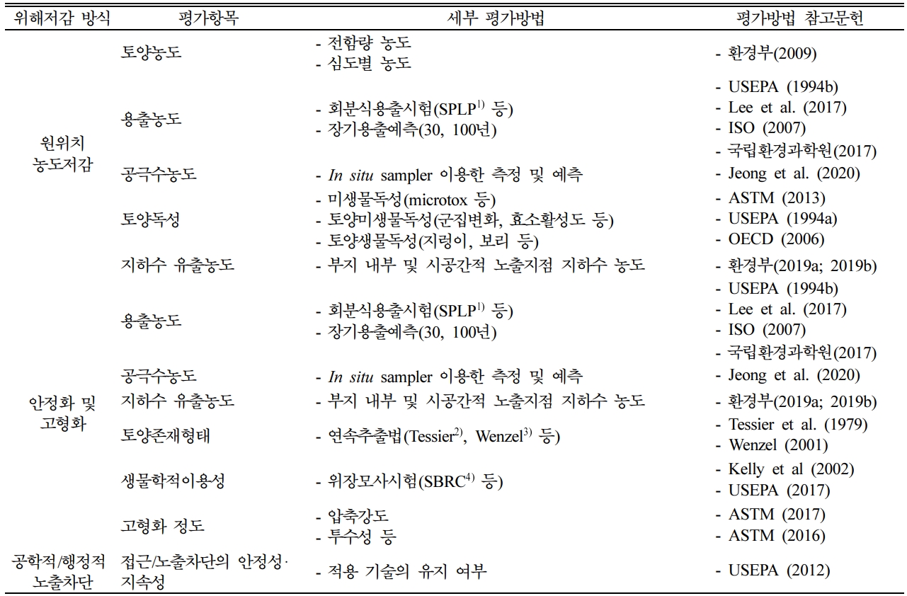 유입되어 위해를 야기할 수 있다. 따라서 원위치 농도저감 기술에 대해서는 토양농도, 용출농도, 공극수농도, 토양독성, 지하수유출농도를 기반으로