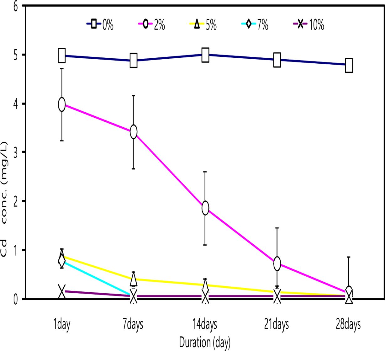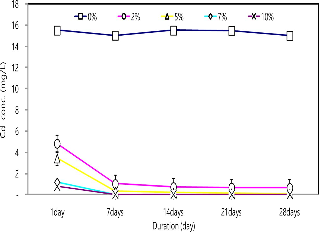 카드뮴 중금속 오염토양의 경우 안정화제 주입량에 따라 높은 안정화 효율을 보였으며 최적 주입량은 5%로 초기 1일차부터 빠른 처리 효율을