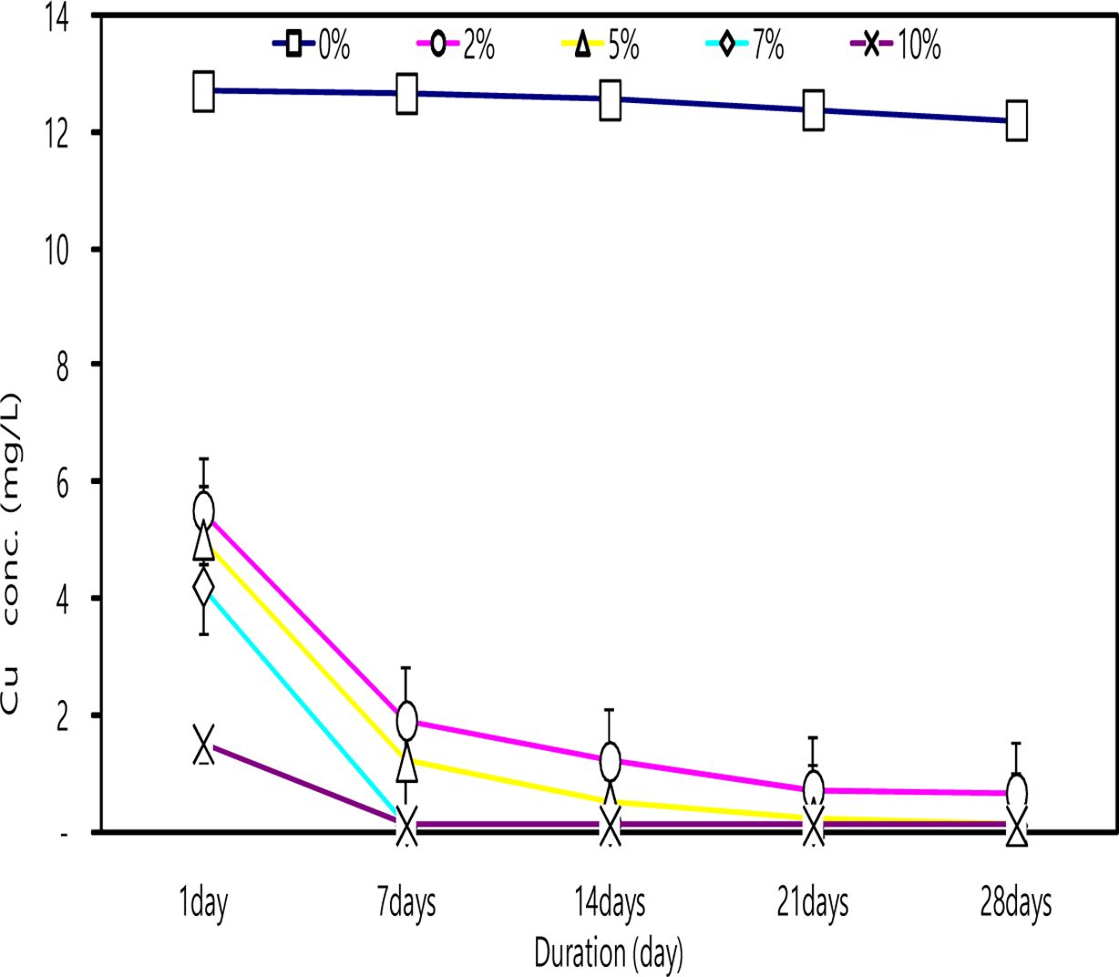그러나 28일차 이후까지도 오염 농도를 지속 유지하였다. 고화제 주입량을 5% 이상으로 증가시켰을 경우 1일차 용출농도는 비교적 안정적으로 감소하였고
