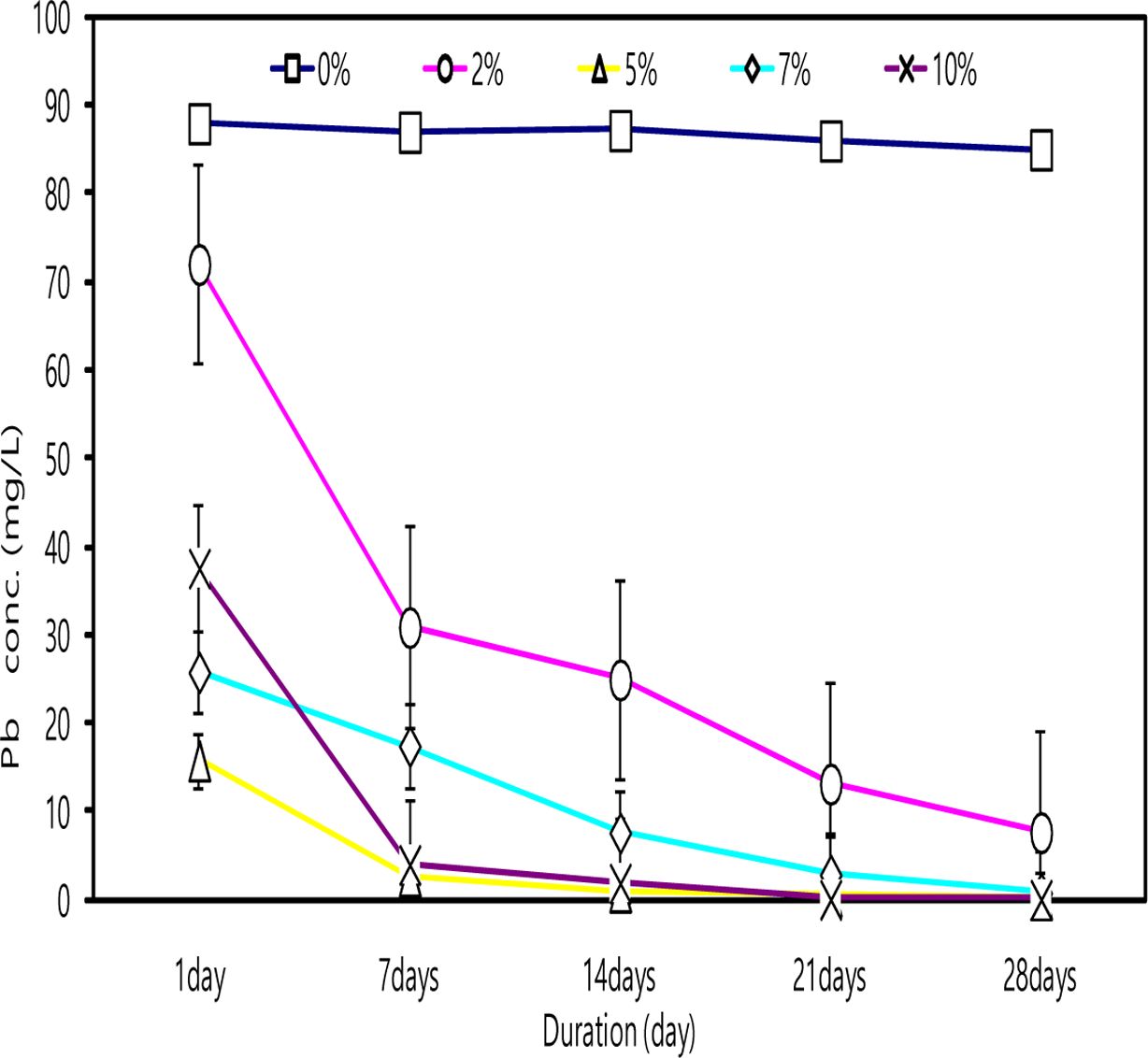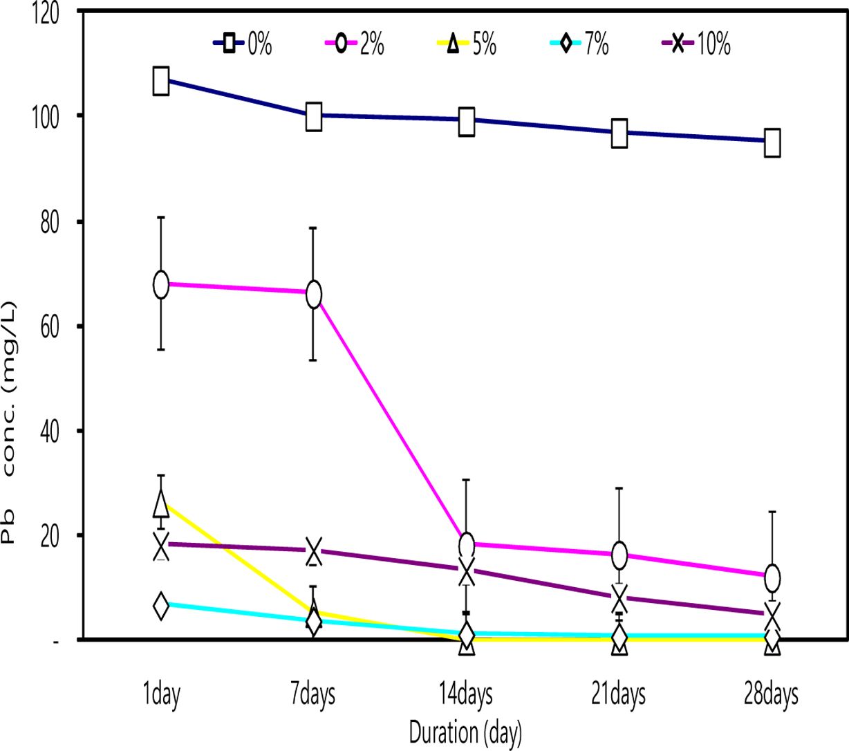 Fig. 4는 Pb의 오염토양 안정화 처리 효율을 보여주고 있다. 안정화제 주입량이 2%일 이하에서 초기 7일차 까지는 안정화 형태를