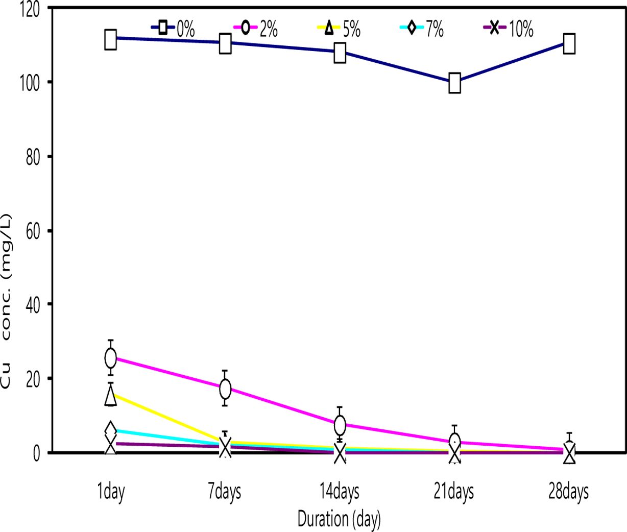불안정 했으나 28일이 경과할 때부터는 2% 이상 주입량에서 99.5% 이상의 안정화 효율을 보였다. 특히 안정화제 7% 이상 주입 시는 검출 한계(0.1 mg/L) 이하의 용출량을 나타냈다. 그러나 고화제 주입을 하지 않은 경우는 거의 안정화되지 못하였다. Cu의 경우 안정화제 최적 주입량은