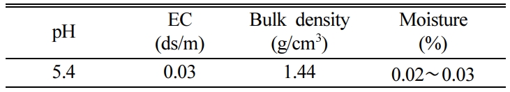 표준 토양(Sand, white quartz 50-70 mesh particle size)을 사용하였다. 그 결과는 Table 1, Table