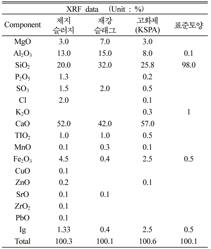 H사의 제지 슬러지 소각 처리제로 탄산 성분을 첨가한 자체 석회 형태의 안정화제를 사용하였다. 먼저 분석에 사용될 시료의 구성성분을 파악하였다.
