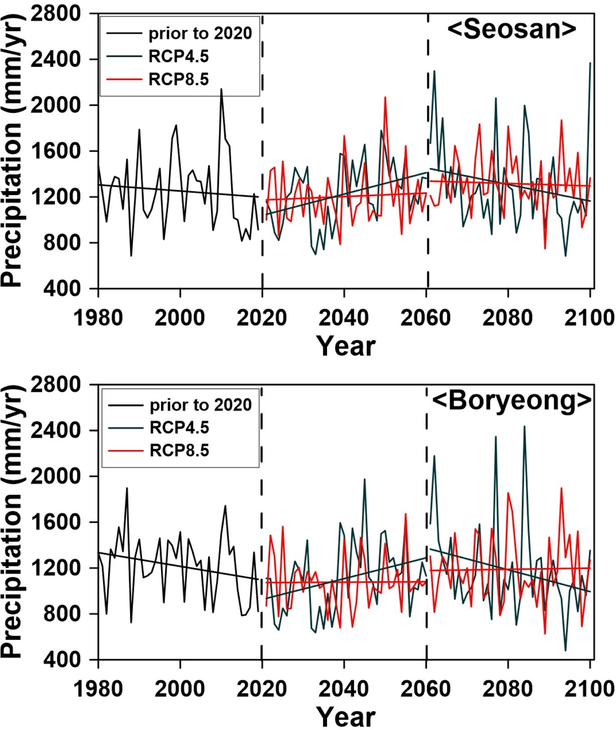 기후변화시나리오에 따른 강수량은 RCP 4.5의 경우 서산과 보령 차례대로 전기는 9.32 mm/년, 9.06 mm/년, 후기는 –7.22 mm/년, –9.52 mm/년으로 두 지역 모두