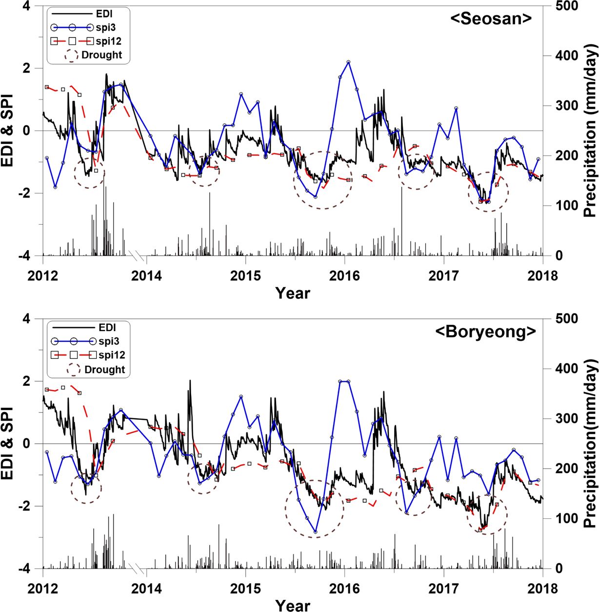 2012년도 5, 6월의 경우 단기가뭄으로써 EDI는 가뭄을 잘 반영하였고, SPI 3은 보령에서만 가뭄을 잘 반영하였다. 반면,