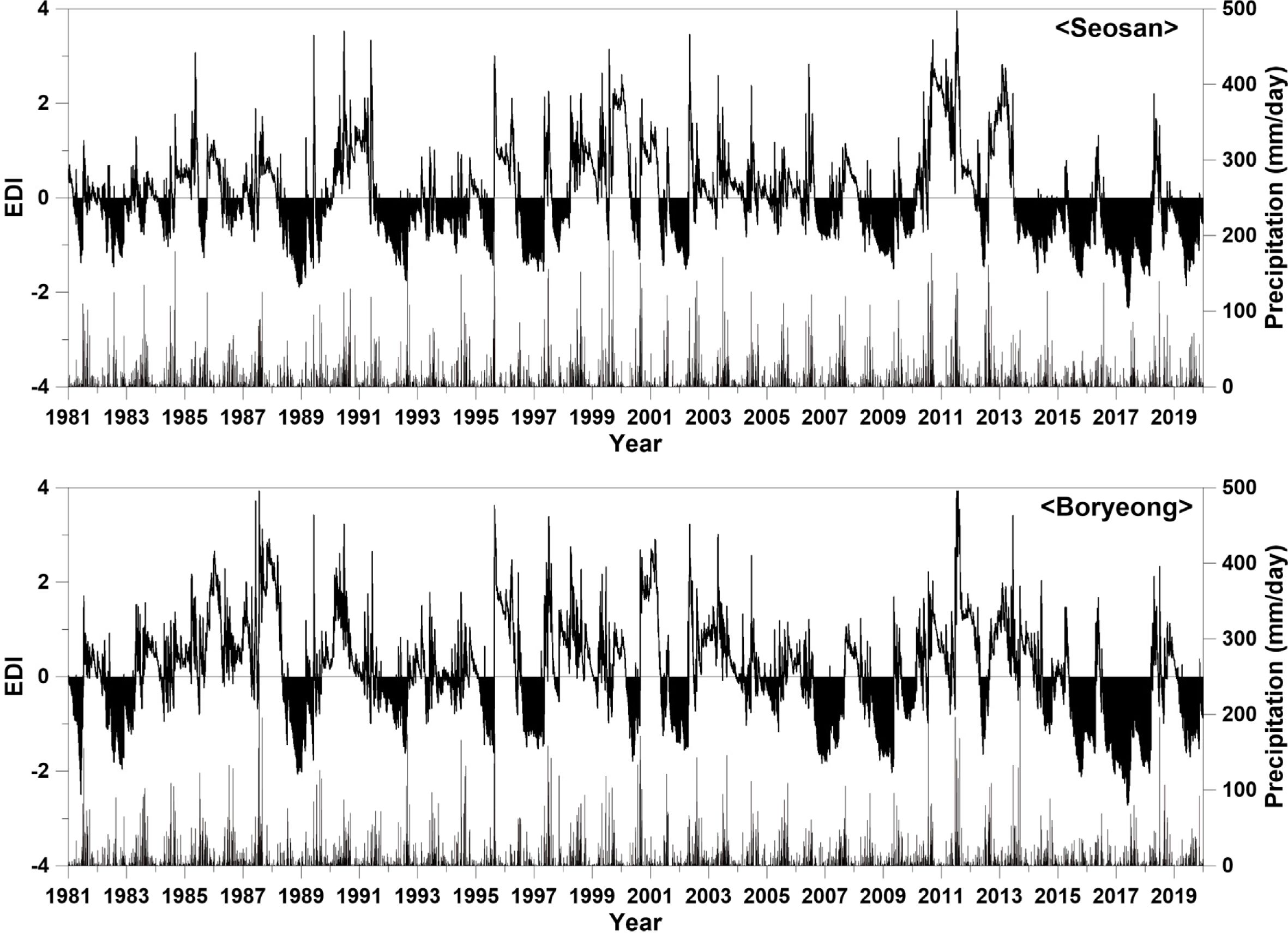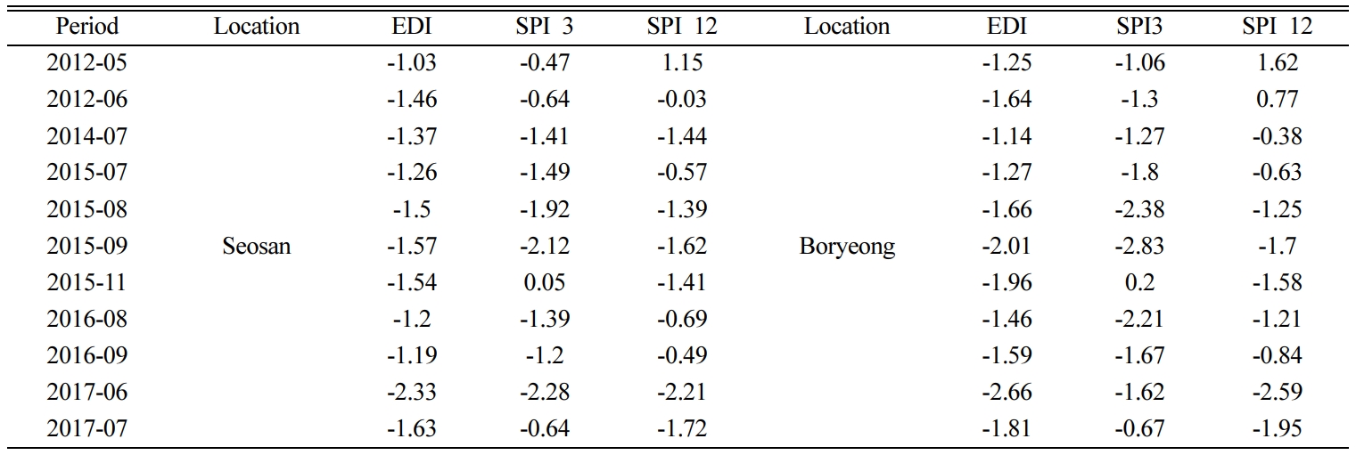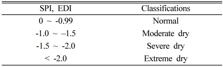 ‘보통 가뭄 이상’(EDI < -1)으로 구분하여 나타내었다(Table