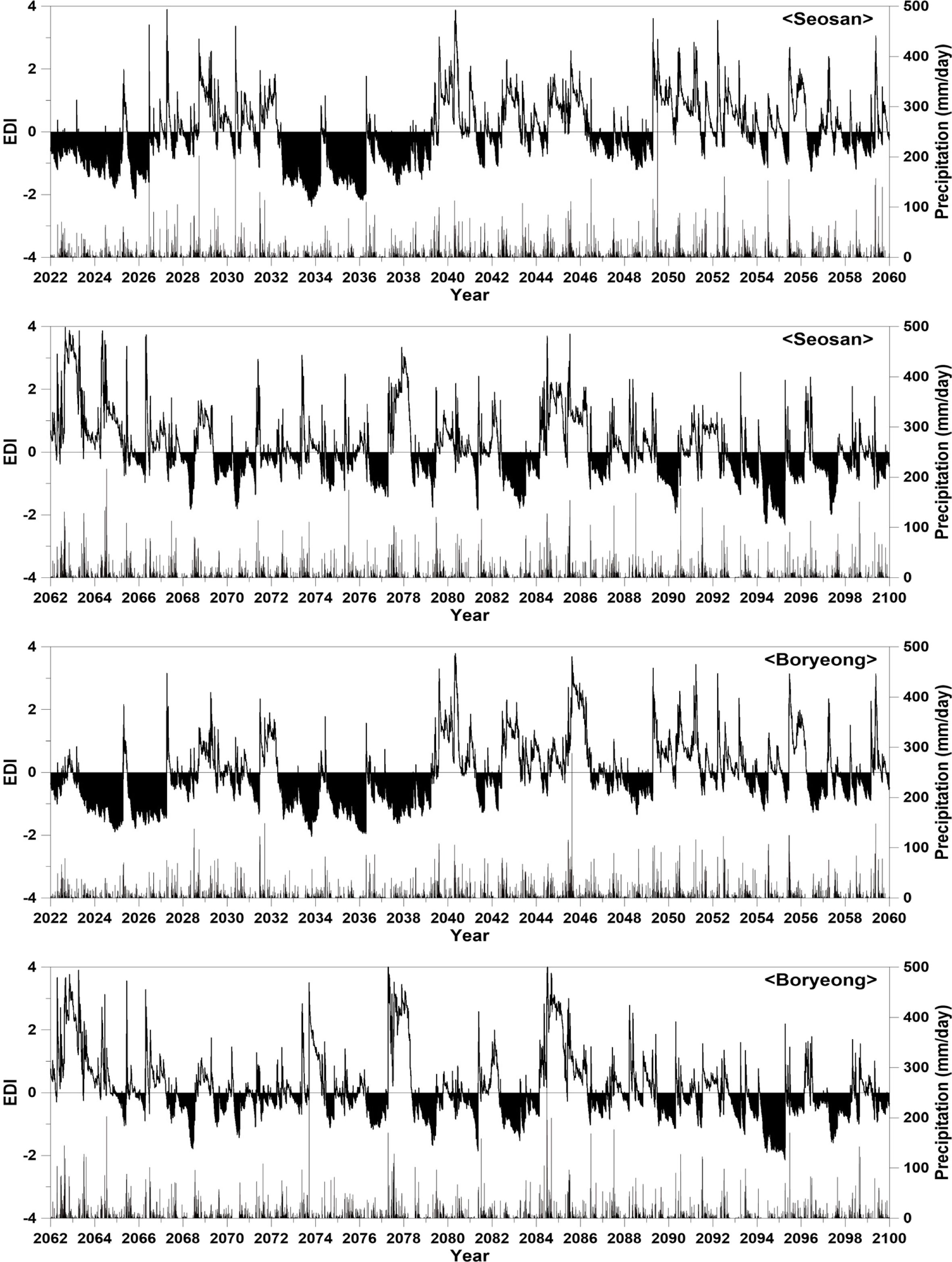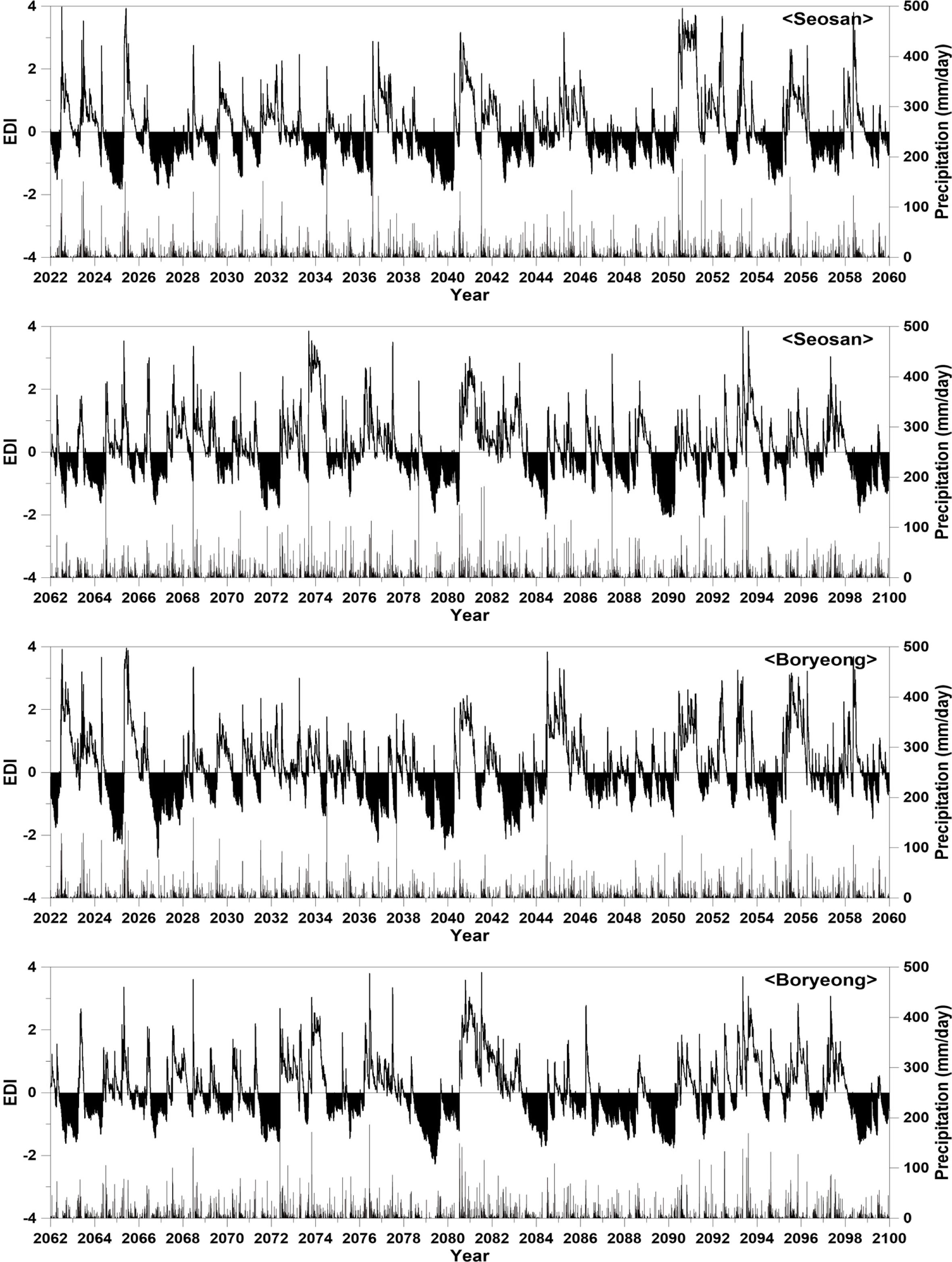 뿐만 아니라 가뭄의 빈도도 더욱 증가할 것으로 추정된다. 이러한 가뭄은 Fig. 5, 6을 보았을 때 과거에 비해 2022~2026년과 2032~2039년에 강도가 큰 장기가뭄이 일어날 것이고 그 이후에는 단기가뭄이 주를 이룰 것으로 예측된다. RCP 4.5 후기의 경우 서산은