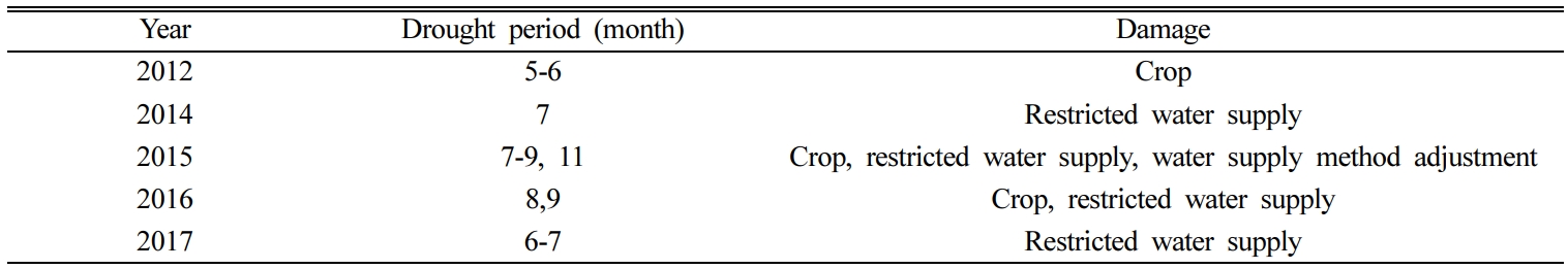 바탕으로 충남지역의 최근가뭄과 그 피해를 편집한 자료이다. Table 1에서 ‘가뭄 기간’은 가뭄 중에서도 실제로 가뭄에 의해 피해를 입은 기간을