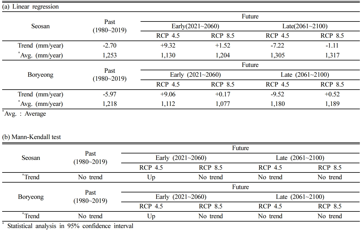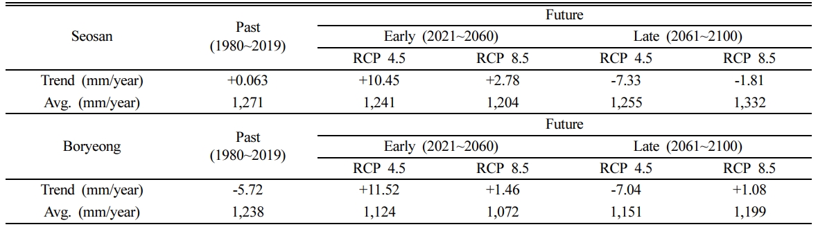 보였고, 그 외 나머지는 과거의 경우와 비슷한 평균을 이루었다. 강수량 경향성을 보면 과거의 경우, 서산은 –2.70 mm/년, 보령은 –5.97 mm/년으로 감소추세를 보였다.