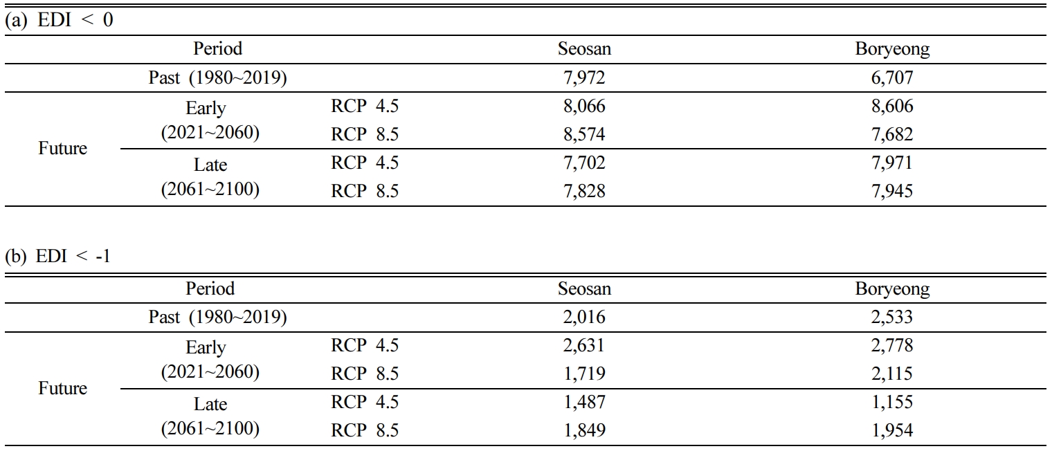 것으로 보아 과거에 비해 강도가 더 큰 가뭄이 올 것으로 추정된다. 보령의 경우 Table 6(a)의 차이가 과거와 월등히 나는 것으로 보아 가뭄강도