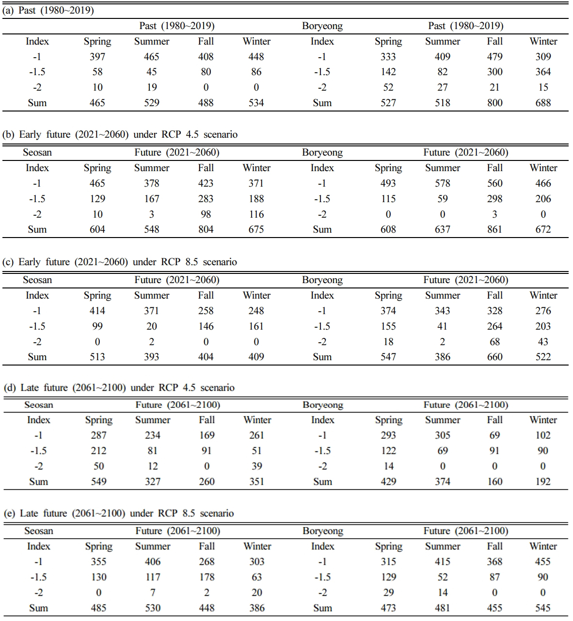 가뭄의 빈도가 가장 크게 나타났다. 보령의 경우는 과거 가을철 가뭄의 빈도가 가장 컸고, 서산과 마찬가지로 RCP 4.5 전기에서 계절별 빈도수가