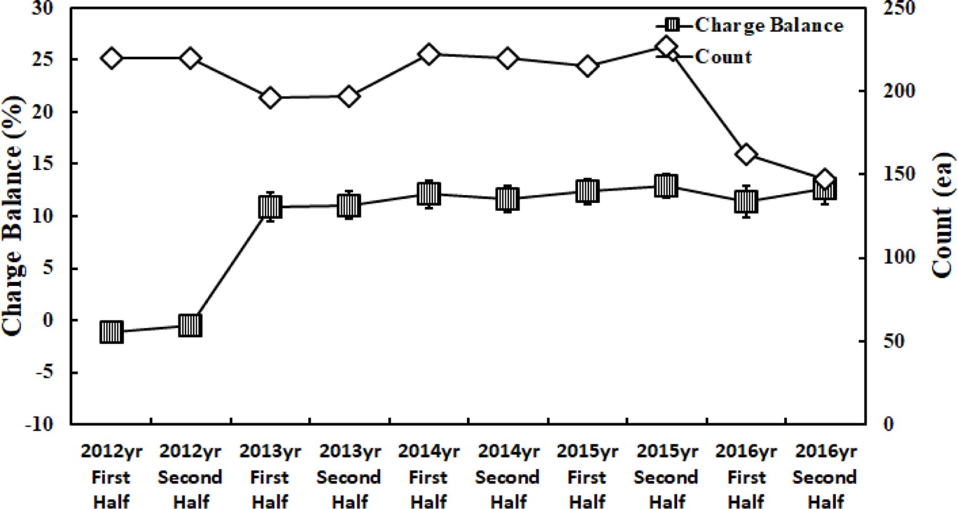 따른 오염원간의 상관관계 도출하고 이를 규명하고자 수행하였다. 본 연구 분석결과는 평균 13.0 ± 0.2%의 전하균형을 나타내는
