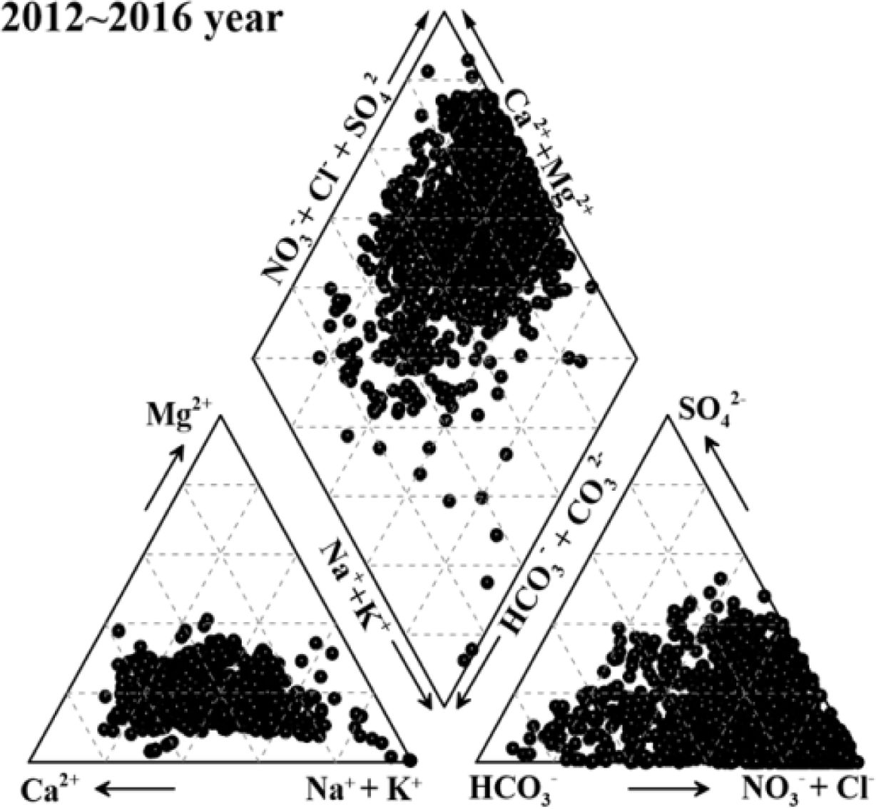 Approximately 80% of the groundwater samples were found to be as Ca2+-(Cl-+NO3-) type groundwater with the concentration ranges