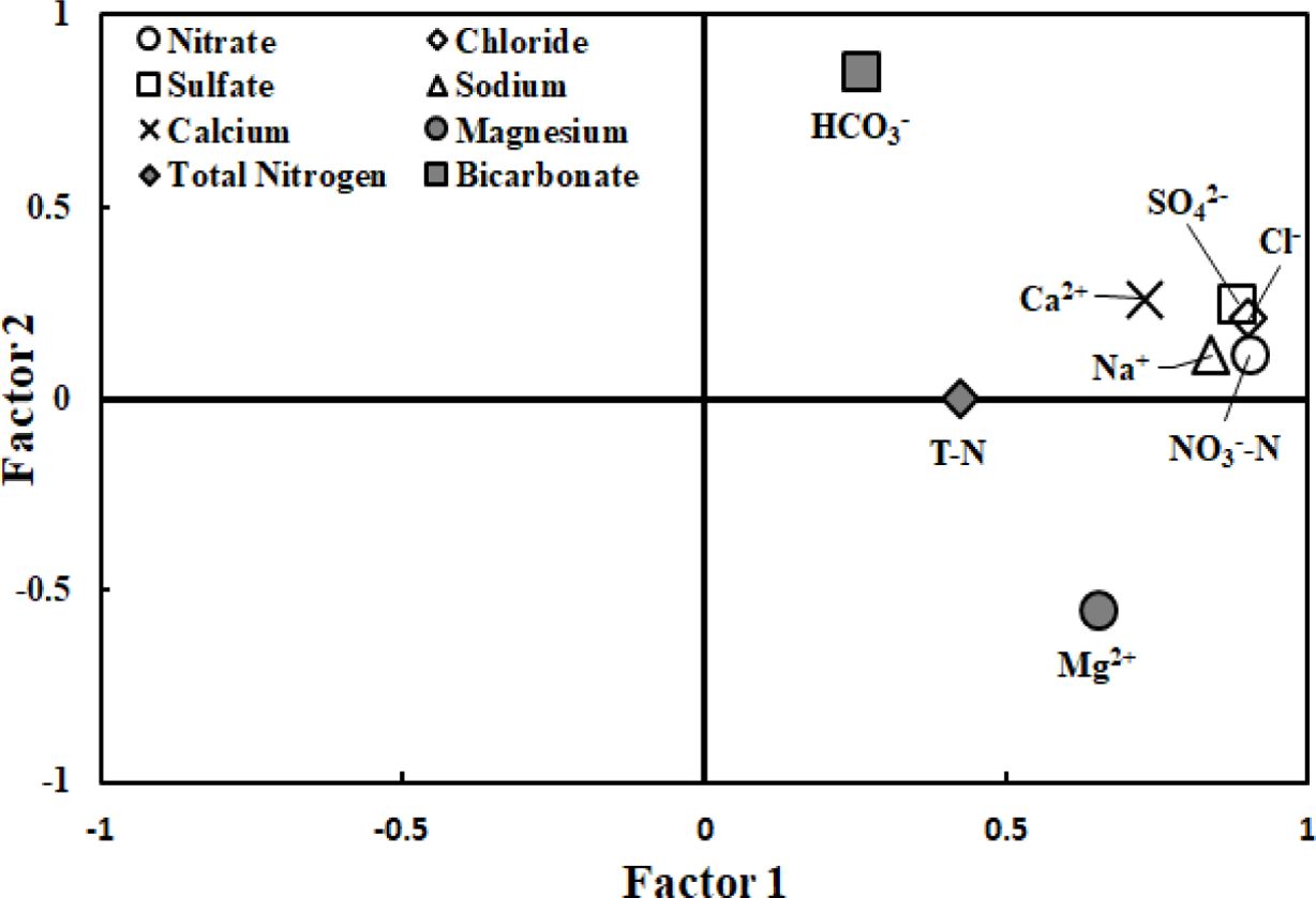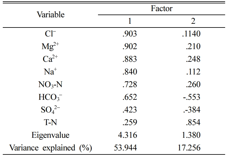 0.000로 유의한 결과를 나타냈고, 요인추출결과 NO3--N와 Cl-, Na+, Ca2+, Mg2+가