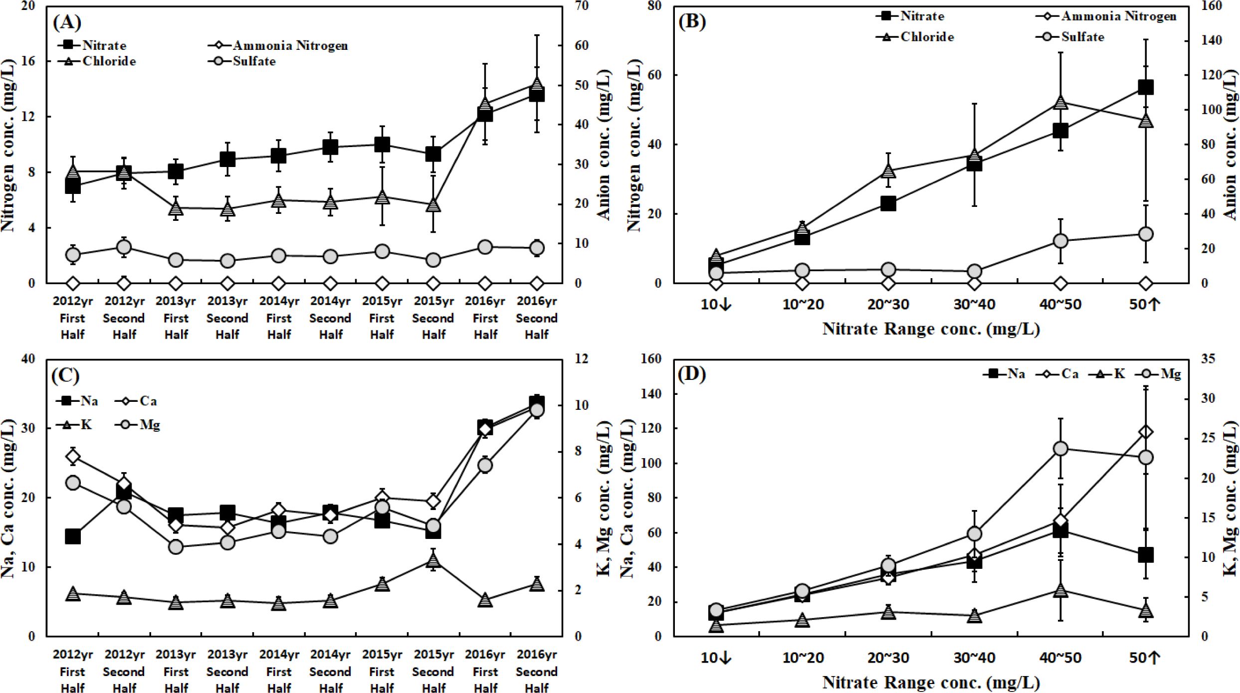 함께 증가하는 경향을 나타났고(Fig. 4-(B), (D)), 이는 기존 농축산지역 내 지하수 조사결과에서 나타나는 NO3--N와 Cl-, Na+, Ca2+, Mg2+ 증가경향과