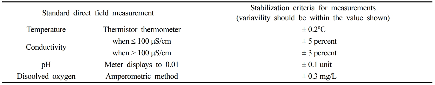 퍼징을 실시한 다음 채취하였다. 현장수질측정 값의 안정화 여부는 미국지질조사소(USGS, 2010)의 자료를 기준으로 판단하였다(Table