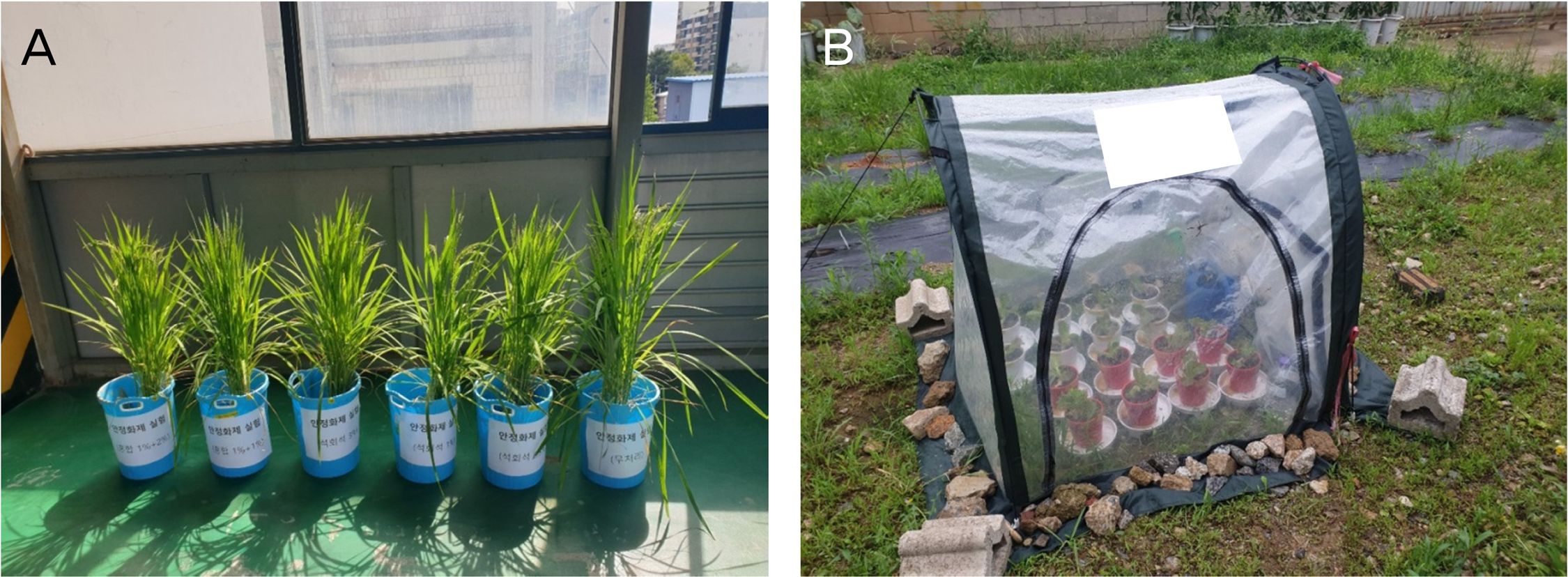 채취된 토양 및 벼를 대상으로 생육조건을 표준화하기 위하여 토양과 벼의 양을 균일화 하였다. 즉, 토양 무게(6 kg)와 벼의 양(3포기)을 일정하게 배치하여 POT실험을 수행하였다. 실험은 실외에서 벼의 재배환경에 적절한 평균 25oC 이내를 유지하고 충분한 일조량을 공급하였으며, 벼의 담수형 생육조건에 따라 환원형 상태로 지속적으로 유지하였다(Fig. 2). 또한, 실험에 사용된 안정화제의 경우 석회석(L) 및 석회석(L)+제강슬래그(S)가 혼합된 안정화제를 사용하였으며, 석회석이 주로 함유하고 있는 성분은 CaO 51.3%로 가장 많은 비율을 차지하고 있으며, 제강슬래그는 CaO 35.9%, Fe 26.6% 및 SiO2 15.5%의 성분을 주로 함유하고 있다(Table 1). 본 연구에 활용된 비율은 토양 대비 석회석(L)의 경우 0.5%, 1.0% 및 3.0%를 적용하였고, 석회석(L)+제강슬래그(S)의 경우 각각 1.0%+ 1.0% 및 1.0%+2.0%를 적용하였다. 실험 전 습식 입도분석법으로 토성을 분류하였으며, 이후 토양에 안정화제가 잘 혼합될 수 있도록 충분히 교반하였다. 재배용수의 경우 동일한 실험조건을 유지하기 위해 동일한 양을 지속적으로 주입하였고, 벼의 성장이 충분히 진행될 수 있도록 64일간 실험을 진행하였다. 화학분석은 실험 전·후 전함량분석(왕수분해법) 및 연속추출(Wenzel et al., 2001)을 수행하여 토양 내 As함량과 단계별 화학적 존재형태를 파악하였다. 또한, 실험 종료 후 벼 작물에 대한 As함량 분석을 통해 안정화 효율 등을 검토하였다.