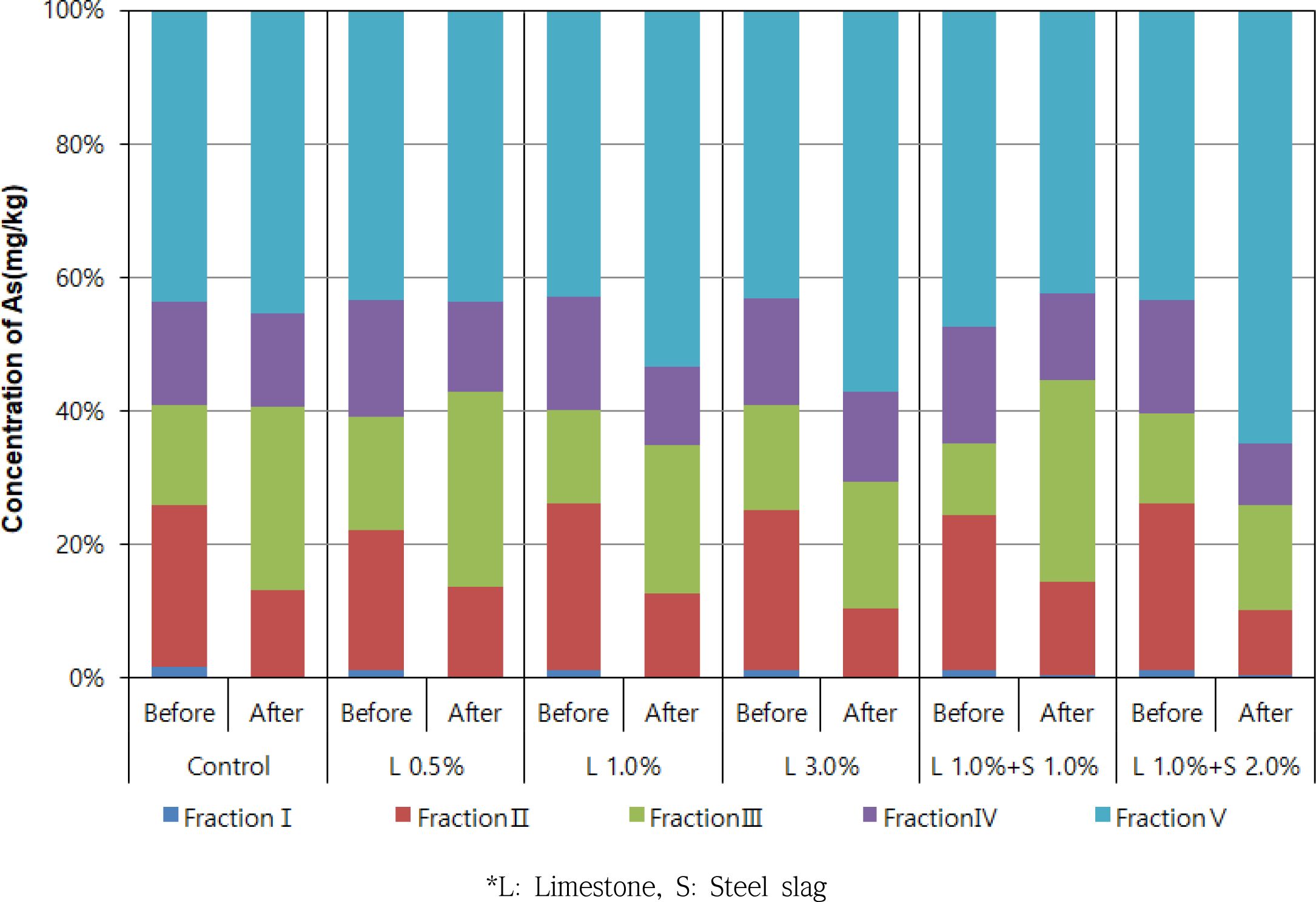답 토양에 대한 실험 전 As의 연속추출 결과들을 종합해 보면 Fraction 1의 형태가 1~2%의 분포 비율을 보이고 있으며, Fraction 2의 경우 21~25%, Fraction 3의 경우 11~17% Fraction 4 및 5의 형태는 16~18% 및 43~ 47%를 보이고 있어 결정구조 내에 강하게 결합되어 있는 Fraction 5(residual As)의 비율이 가장 높은 것으로 평가되었다(Fig. 3). 다양한 안정화제를 적용하여 벼 작물 재배 후 연속추출을 수행한 결과, 식물 이용 가능성이 높은 Fraction 1과 Fraction 2의 결합 형태가 감소하고 Fraction 3의 형태가 증가한 것으로 평가되었다. 이러한 결과를 좀 더 구체적으로 살펴보면, 무처리 대조군의 경우 실험 전과 후의 농도 차이는 Fraction 1과 2의 감소에 따른 영향으로 평가되었으며, 무처리에 비하여 Fraction 1과 2의 감소폭이 낮을수록 안정화 효율이 있는 것으로 평가할 수 있다. Fig. 4은 연속추출결과를 절대함량으로 도시한 그래프로 큰 차이는 보이지 않지만 무처리에 비해 L0.5%와 L1.0%+S1.0%에서 안정화 효율이 있는 것으로 평가되었다.