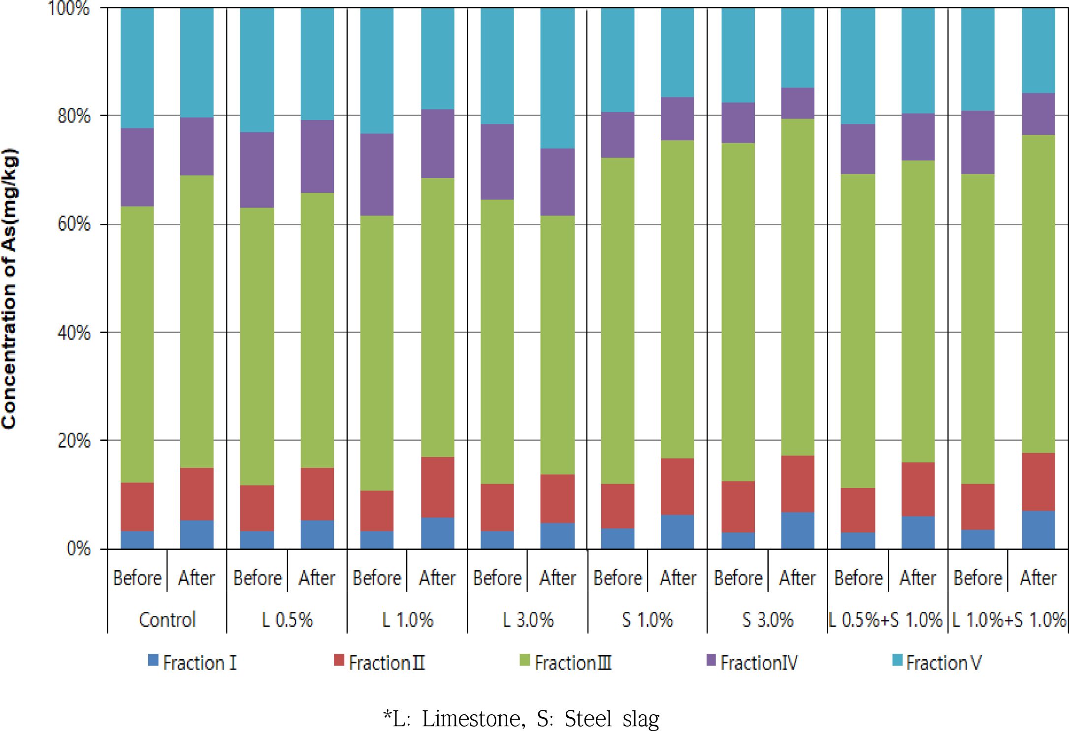 전 토양에 대한 실험 전 As의 연속추출결과들을 종합해 보면 Fraction 1의 형태가 5~7%의 분포 비율을 보이고 있으며, Fraction 2~5는 각각 9~11%, 48~62%, 6~ 13% 및 15~26%를 보이고 있어 비결정질 Fe-Al 산화물 결합 형태로 존재하는 Fraction 3의 비율이 가장 높은 것으로 평가되었다(Fig. 5). 다양한 안정화제를 적용하여 상추 재배 후 연속추출을 수행한 결과, 안정화 처리구별 다소 차이는 있지만 실험 전과 비교하여 Fraction 1~ Fraction 3에서 실험 후 As의 농도가 감소한 것으로 평가되었다. 이러한 결과를 좀 더 구체적으로 살펴보면, 무처리 대조군의 경우 실험 전과 후의 농도 차이는 주로 Fraction 3의 감소로 평가되며, Fraction 3의 감소폭이 낮을수록 안정화 효율이 있는 것으로 평가할 수 있다. Fig. 6은 연속추출결과를 절대함량으로 도시한 그래프로 무처리에 비해 S1.0%와 S3.0% 및 L1.0%+S1.0%에서 안정화 효율이 있는 것으로 평가되었다.
