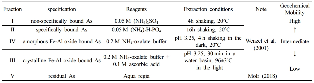 연속추출법의 경우 토양으로부터 식물이 흡수 가능한 금속의 함량을 예측하고, 이를 이용하여 금속이 토양에서 식물로 이동되는 경로를 추적하여 장기적인 오염원의 처리에 유용한 정보를 얻을 수 있다(Jung, 1994). As의 경우 주로 Wenzel et al.(2001)의 방법을 주로 활용하고 있으며, 이 방법에 의하면 Fraction(I)은 비 특이적 결합 비소(non-specifically bound As), Fraction(II)는 특이적 결합 비소(specifically bound As), Fraction(III)은 비결정질 철-알루미늄 산화물 결합 비소(amorphous Fe-Al oxide bound As), Fraction(IV)는 결정질 철-알루미늄 산화물 결합 비소(crystalline Fe-Al oxide bound As) 그리고 Fraction (V)는 잔류 비소(residual As) 등으로 구분하고 있다. 이를 비소의 지구화학적 거동과 비교 시 존재형태의 단계가 낮을수록 비소의 이동성이 높아 쉽게 용출되어 주변에 영향을 미칠 수 있으며, 반대로 존재형태가 높을수록 비소의 이동성이 낮아 영향범위가 제한적이다(Table 2).