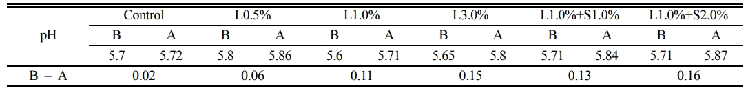 실험 종료 후 상추의 As 농도 분석 결과, 무처리의 경우 3.40 mg/kg으로 검출되었고, 모든 안정화 처리구에서는 2.30~4.14 mg/kg의 범위로 검출되었다(Table 8). 이러한 결과를 무처리와 비교하면 L3.0%와 S3.0%에서 각각 21%와 6%의 감소 효율이 있는 것으로 평가 되었고, 혼합의 경우, L0.5%+S1.0%에서 32% 및 L1.0%+S1.0%에서 25%의 안정화 효율이 있는 것으로 평가되었다.