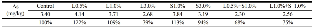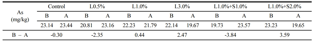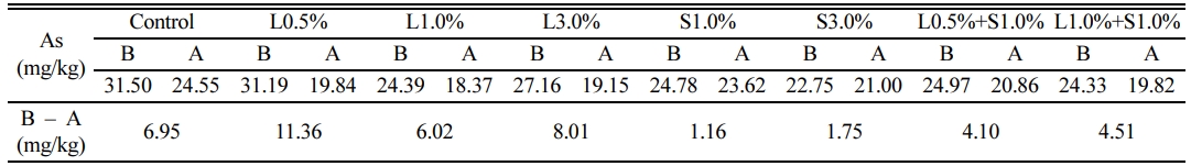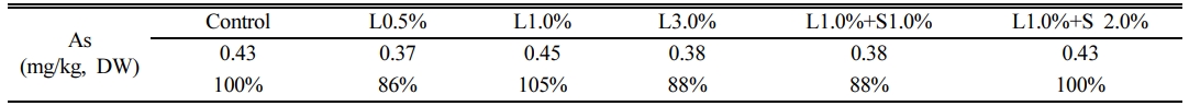 실험 종료 후 벼의 As 농도 분석 결과, 무처리의 경우 0.43 mg/kg(DW)으로 검출되었고, 모든 안정화 처리구에서는 0.38~0.45 mg/kg(DW)의 범위로 검출되었다(Table 5). 무처리와 비교하여 L0.5%는 14%의 감소 효율이 있는 것으로 평가되었고, L3.0%와 L1.0%+S1.0%에서 12%의 감소 효율이 있는 것으로 평가되었다.