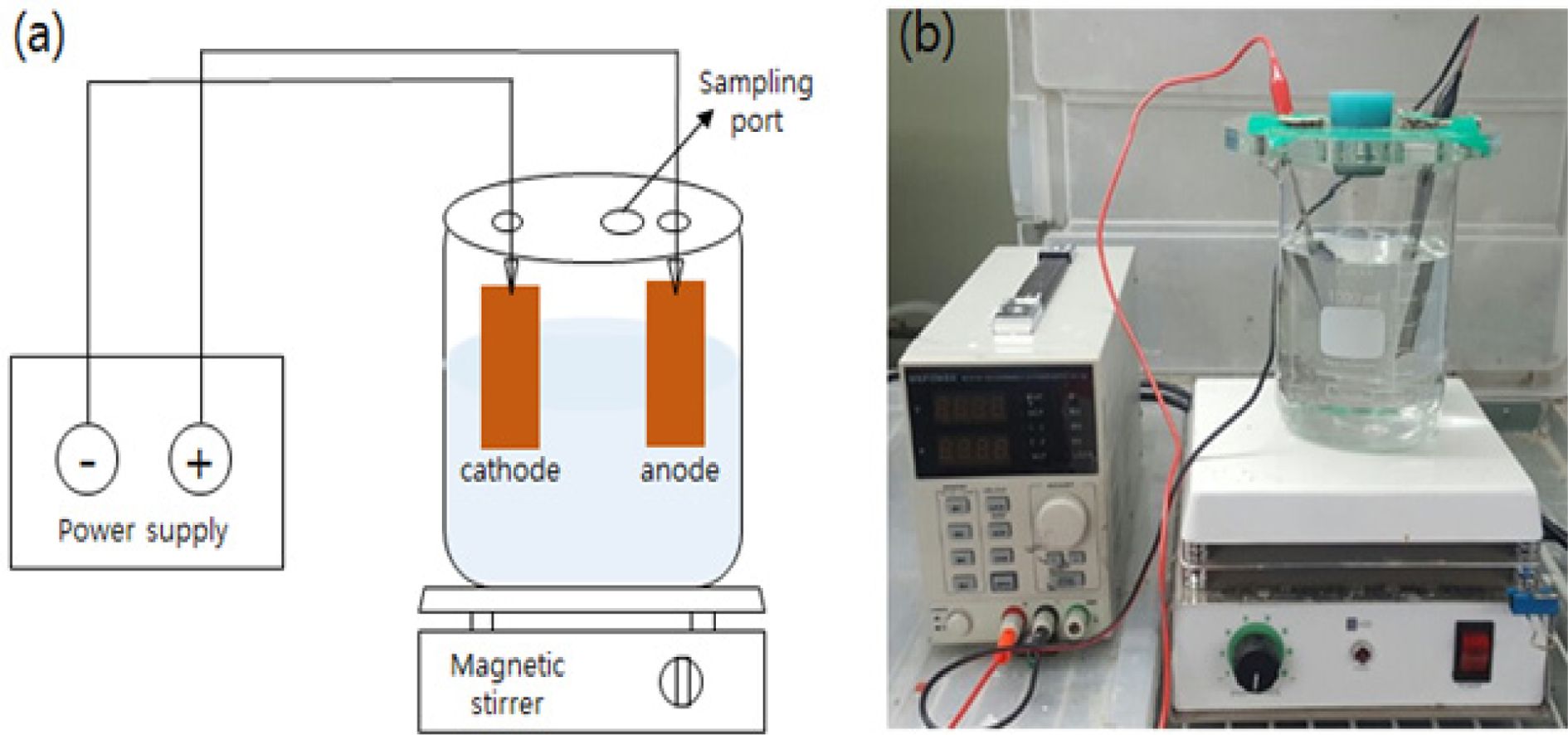 전기화학적 산화에 사용된 탄소 전극은 Toyo(Japan)로 부터 구매하여 5 × 10 × 0.1 cm 크기로 잘라 사용하였으며, 각 전극 간격은 8 cm로 하였다. 전원공급장치(MK-3005D, MK power, Korea)로 전류 밀도를 조절하였으며, 실험 모식도 및 실험 장치를 Fig. 1에 나타내었다. 모든 실험은 3회 반복으로 수행하였으며, 1 L 비커에 미리 제조하여 준비한 2,4-D stock 용액을 2,4-D 농도 1 mM이 되도록 주입하여 과황산 용액을 일정 농도가 되도록 주입한 후 총 반응용액의 부피가 1 L가 되도록 하였다. 전류밀도를 설정하고 기계식 교반기(HT-120DX, Daihan Scientific Co., Ltd., Korea)을 이용하여 200 rpm으로 교반하였다. 시간대별로 시료 5 mL를 채취하여 1 M n-butanol(CH3 (CH2)CH2OH, Yakuri, 98.0%)을 넣어 quenching(Chan et al., 2017)한 다음, 0.45-μm polytetrafluoroethylene syringe filter(PTFE membrane, Ф= 25 mm, Whatman, USA)로 여과 후 HPLC(high-performance liquid chromato- graphy, 2695 Alliance, Waters, USA)를 이용하여 2,4-D 농도를 분석하였다. 활성화제의 첨가 영향 실험에서는 앞선 전기화학적 산화 실험과 동일하게 2,4-D와 과황산, 전해질을 주입한 후 Fe(II)를 일정 농도가 되도록 주입한 후 실험을 수행하였다. 초기 pH 및 음이온 영향을 평가하기 위하여 2,4-D, 과황산, 전해질과 Fe(II)를 동일한 방법으로 주입한 다음, 초기 pH의 경우 0.1 N 염산(Hydro- chloric acid, HCl, Duksan, 35~37%)과 수산화나트륨(sodium hydroxide, NaOH, Duksan, 93%) 용액을 이용하여 초기 pH를 3, 5, 7, 9로 조절하여 실험하였고, 음이온 영향 실험의 경우 20 mM의 염화나트륨(NaCl, Duksan, 99%)과 탄산수소나트륨(NaHCO3, Duksan, 99.5%)를 주입하여 실험하였다.