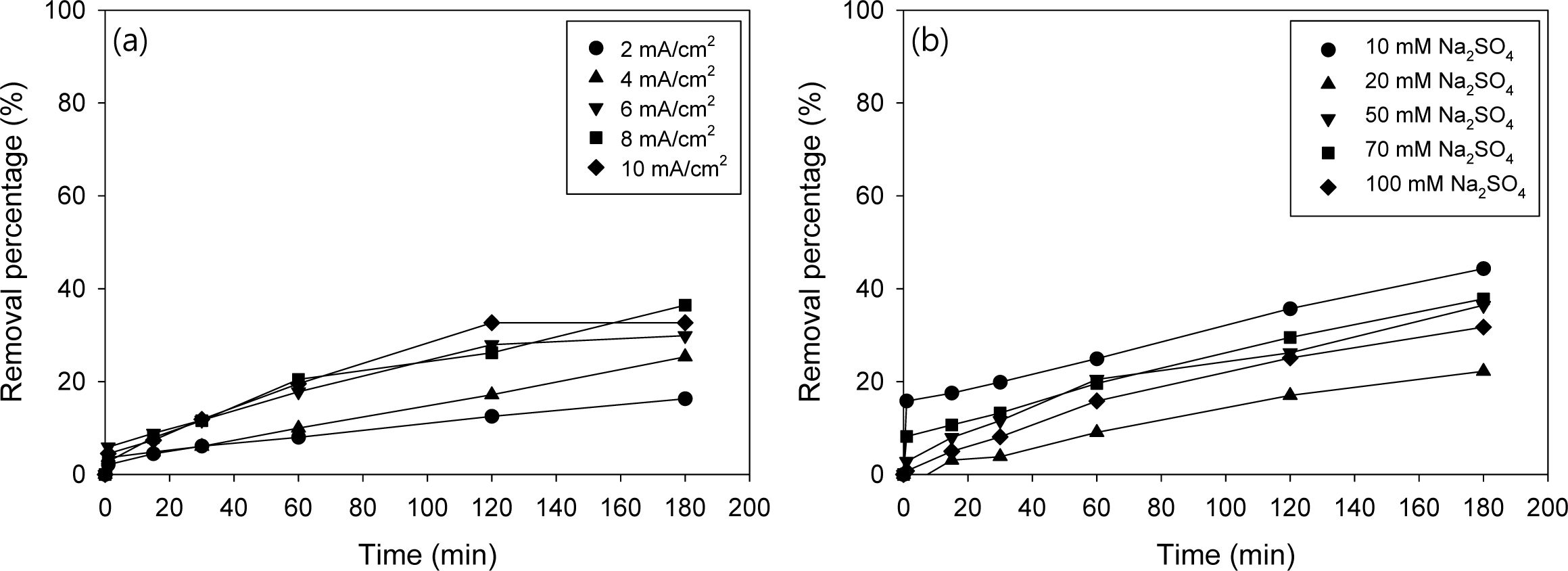 전기 산화(electro-oxidation, EO) 처리시 전류밀도의 영향을 평가하기 위하여 2,4-D 농도 1 mM, 전해질 Na2SO4 용액 농도 50 mM로 고정하고, 전류밀도를 2, 4, 6, 8, 10 mA/cm2으로 변화하여 실험하였다. 실험 결과는 Fig. 2에 나타내었다. 전류밀도가 증가할수록 제거율은 16, 25, 30, 36, 33%로 증가하였으며 6~10 mA/cm2에서는 큰 차이는 없는 것으로 나타났다. 2,4-D 농도 1 mM, 전류밀도는 8 mA/cm2으로 고정하고 전해질 Na2SO4 농도를 10, 20, 50, 70, 100 mM로 변화하여 실험한 결과를 Fig. 1(b)에 나타내었으며, 10 mM 농도일 때 제거효율이 가장 높게 나타났다. 이후 전기화학적 산화 실험에서 최적 전류밀도는 8 mA/cm2. 전해질 농도는 10 mM로 하여 실험하였다.