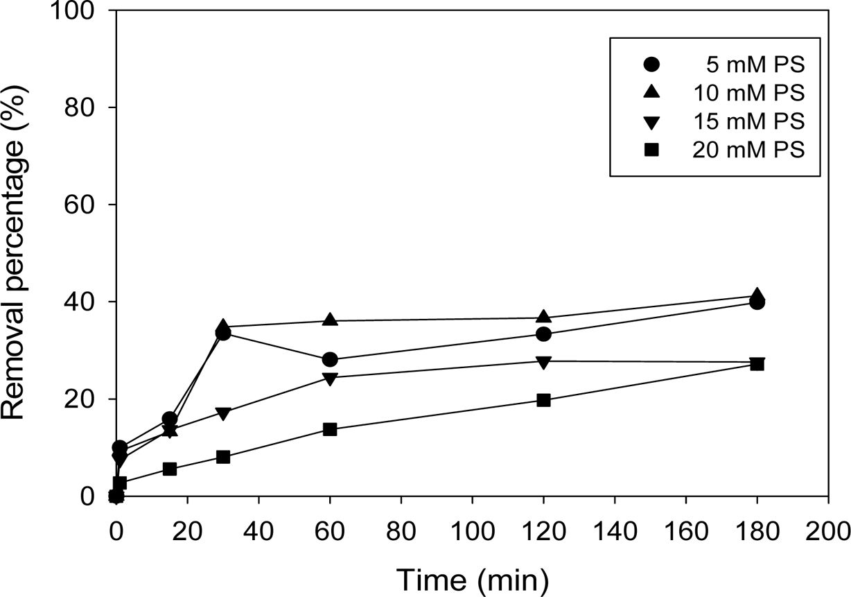 Fig. 3 Effect of PS concentration on 2,4-D removal efficiency by PS/ECO process (experiment conditions: 2,4-D = 1 mM, Na2SO4 = 10mM, current density = 8 mA/cm2 , and PS = 5, 10, 15, 20mM). |