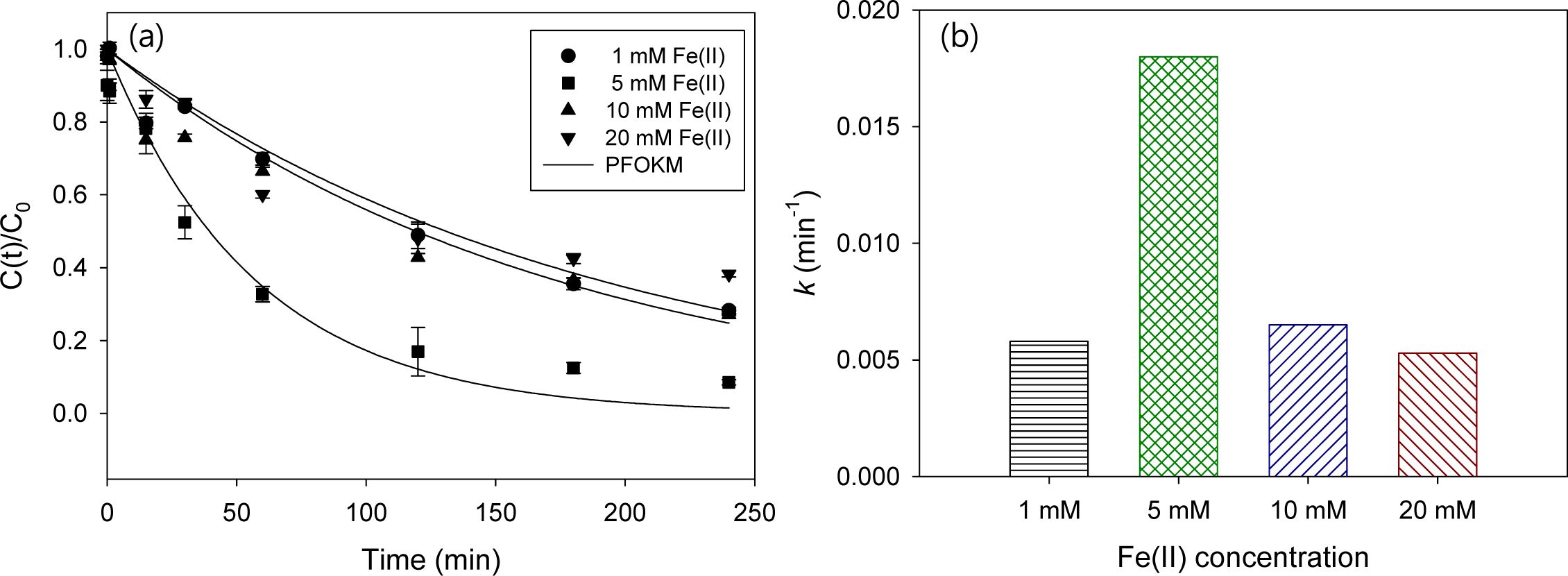 Fig. 3에서 알 수 있듯이 PS/ECO 공정에 의한 2,4-D의 제거효율이 최대 51%로 제한되며, 이를 개선하기 위해 Fe(II) 추가의 영향을 살펴보았다.