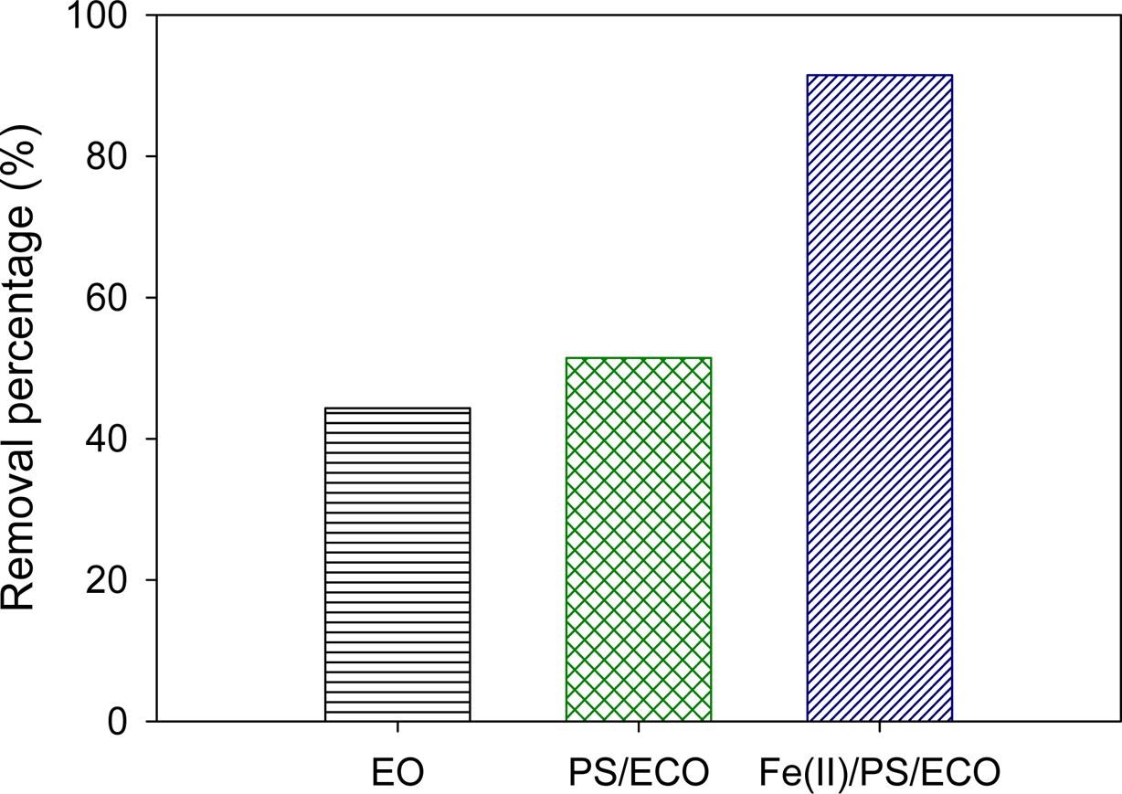 Fig. 5 Effect of the oxidation process type on 2,4-D removal (EO = electro-oxidation at current density = 8 mA/cm2 , Na2SO4 = 10mM, PS/ECO = persulfate-electrochemical oxidation at current density = 8 mA/cm2 , Na2SO4= 10mM, and PS = 10mM, and Fe(II)/PS/ECO = Fe(II) activated persulfate-electrochemical oxidation at current density = 8 mA/cm2 , Na2SO4 = 10 mM, PS = 10mM, and Fe(II) = 5 mM). |