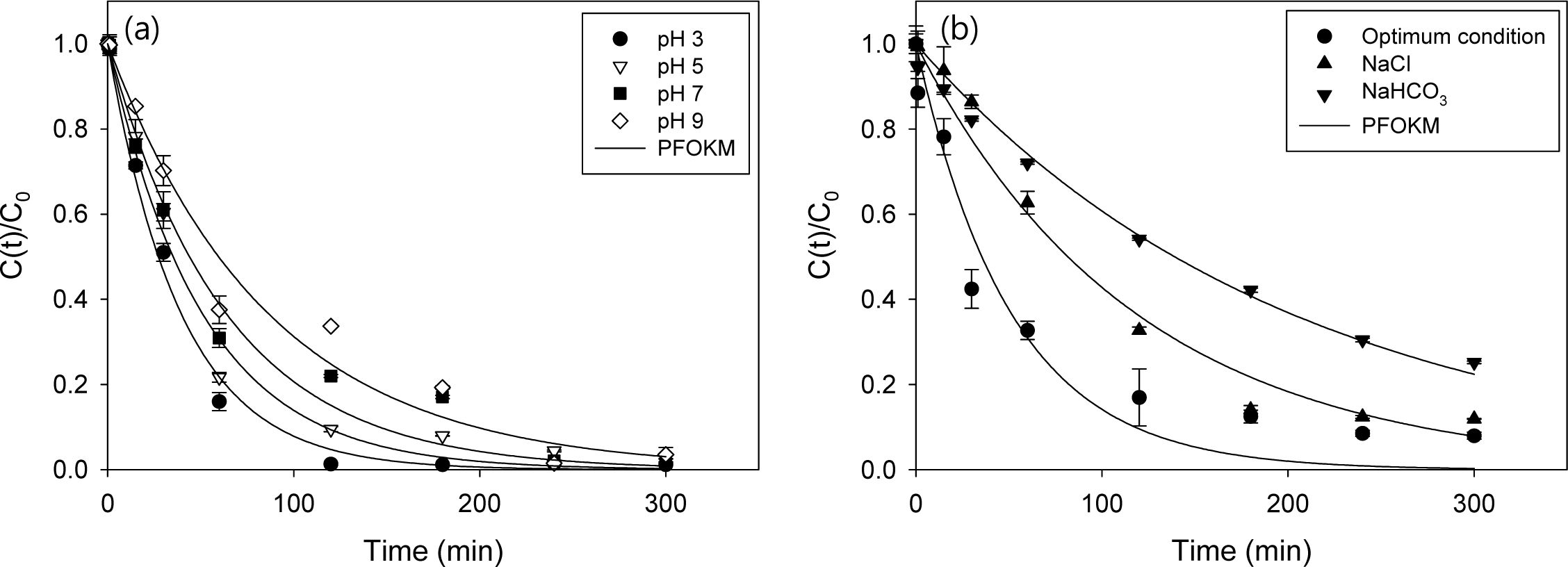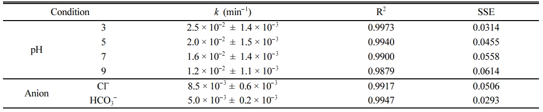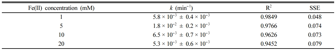 여기서 C(t)는 반응시간 t(min)에서 산화 후 2,4-D의 농도(mmol/L), C0는 초기 2,4-D의 농도(mmol/L), k는 PFOKM의 반응속도 상수(min-1)이다. 각 모델의 매개변수는 Table Curve 2D®(Version 5.1, SPSS, Inc.)를 이용하여 결정하였다.