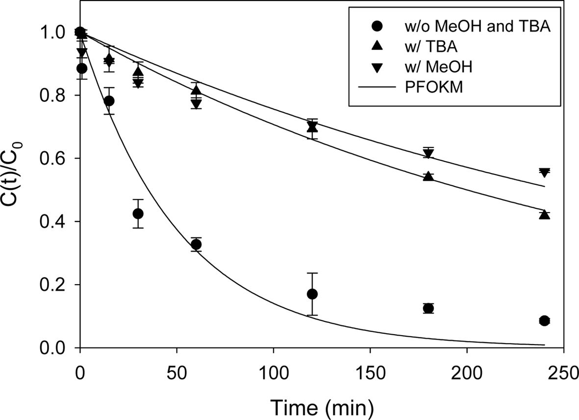 과황산-전기화학적 산화 실험에서 라디칼 반응 기작을 규명하기 위하여 scavenger 실험을 수행하였다. tert-butyl alcohol(TBA, C4H10O, Daejung, 99.0%)를 hydroxyl radical (•OH)로, 메탄올(MeOH, CH3OH, Merck Company, LC grade)를 hydroxyl radical(•OH)과 sulfate radical(SO4•−)의 scavenger로 선정하여 실험하였다(Cai et al., 2018). 과황산-전기화학적 산화 실험과 동일하게 진행하되 probe/scavenger 시약 주입하여 실험 진행 후 2,4-D의 농도를 분석하여 평가하였다.